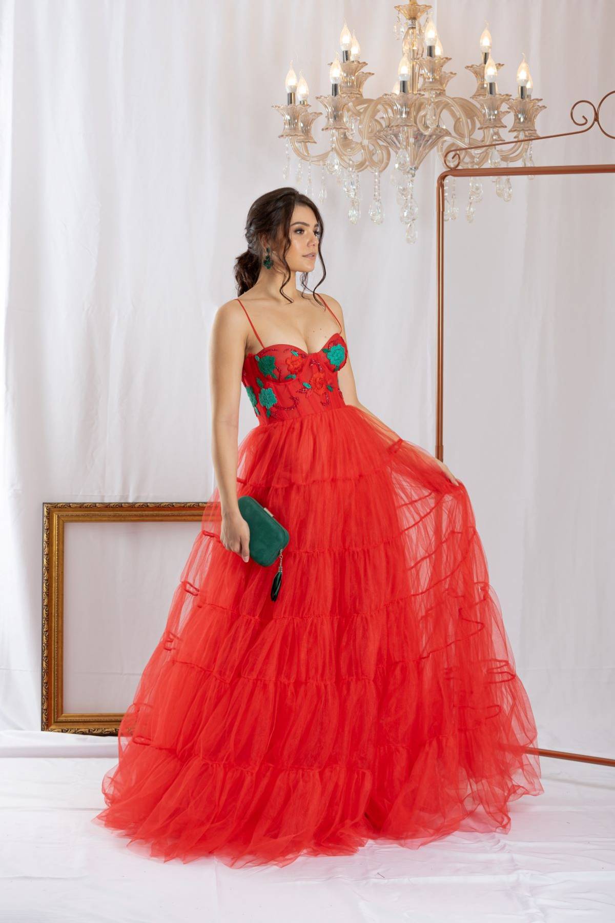 Descrição:Vestido longo em vermelho, tule, armação, parte superior corpete, alcinha, saia longa. semibordado