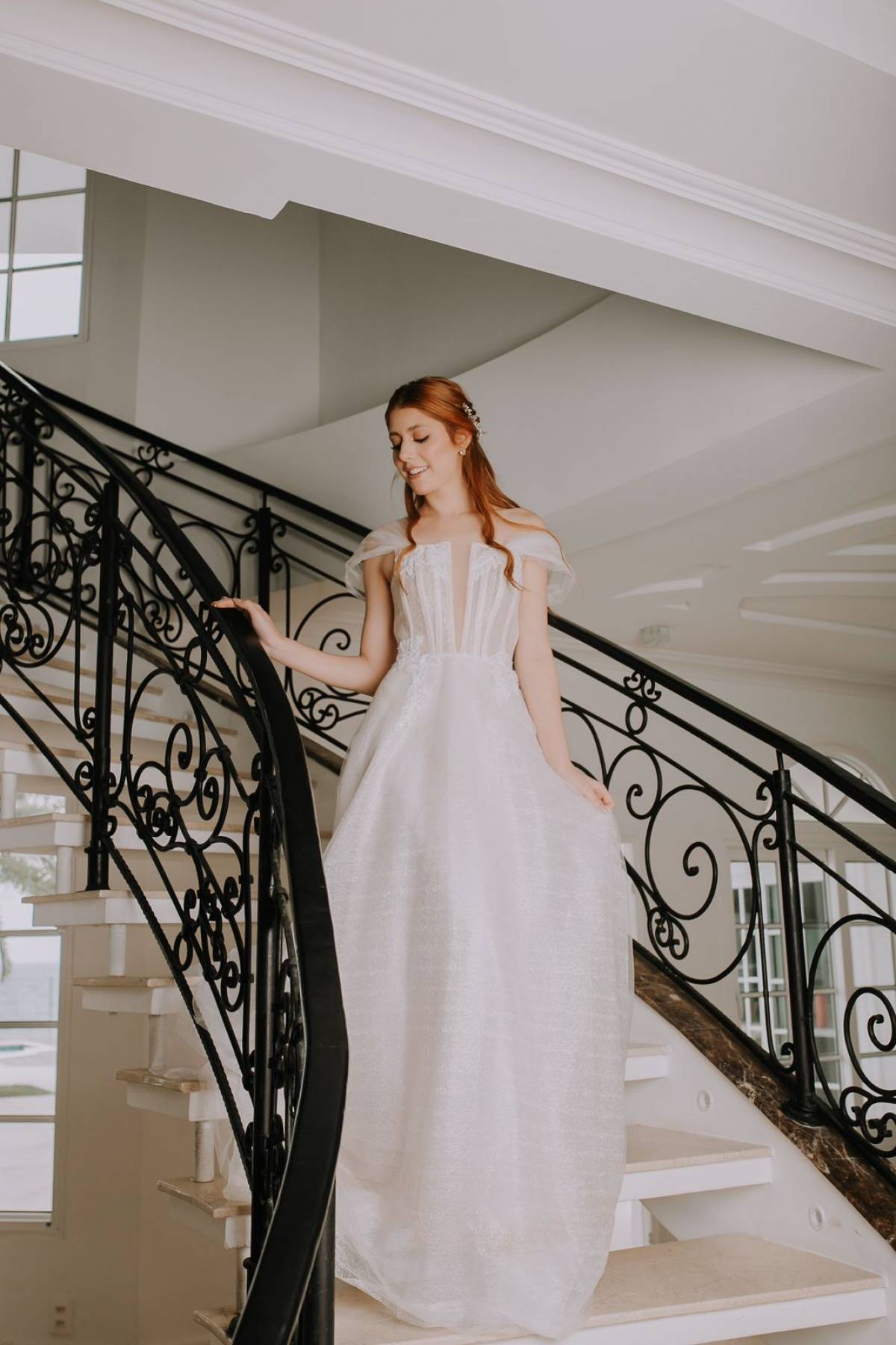 Descrição:Vestido de noiva, de tule com organza especial, corpo em corselet, ombro a ombro, com decote quadrado