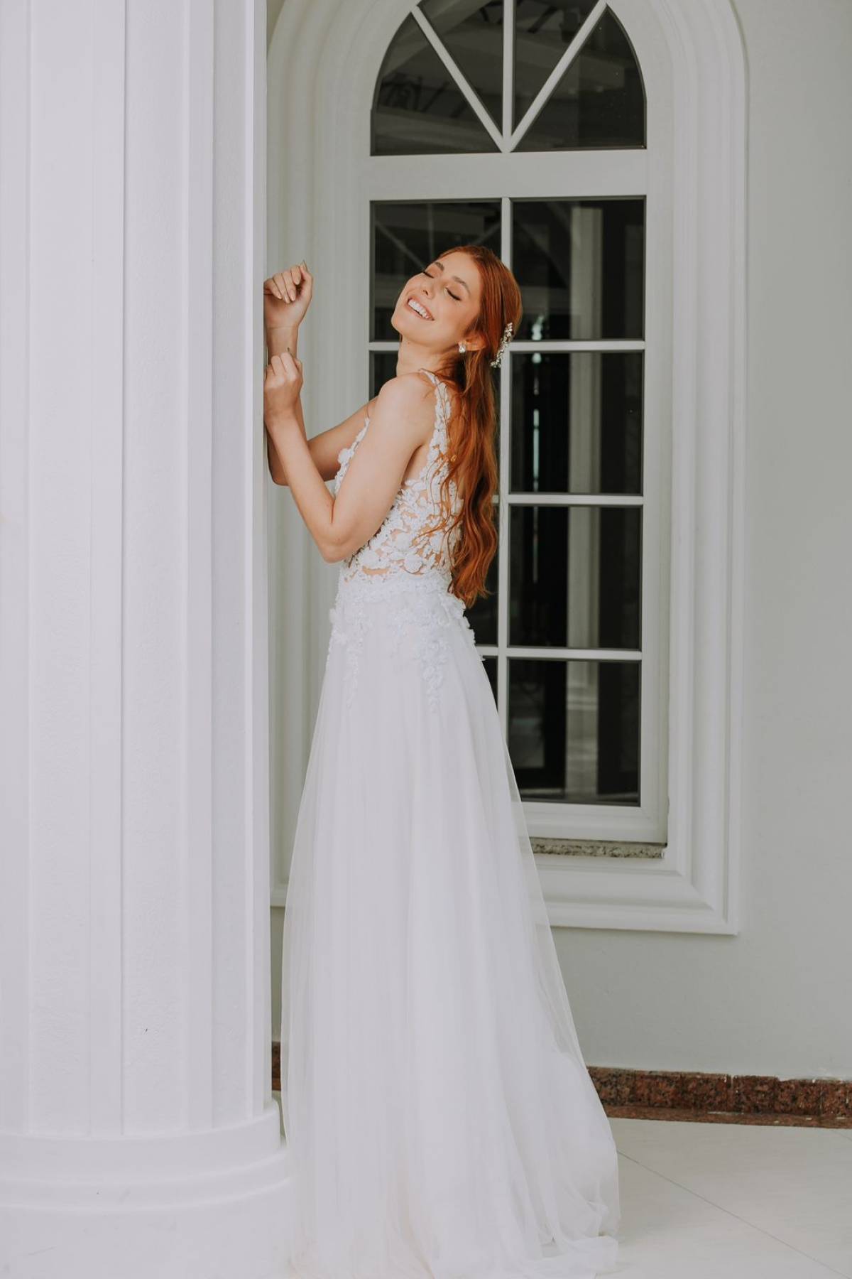 Descrição:Vestido branco de noiva, com busto bordado 3d, pedraria, saia de tule com fenda