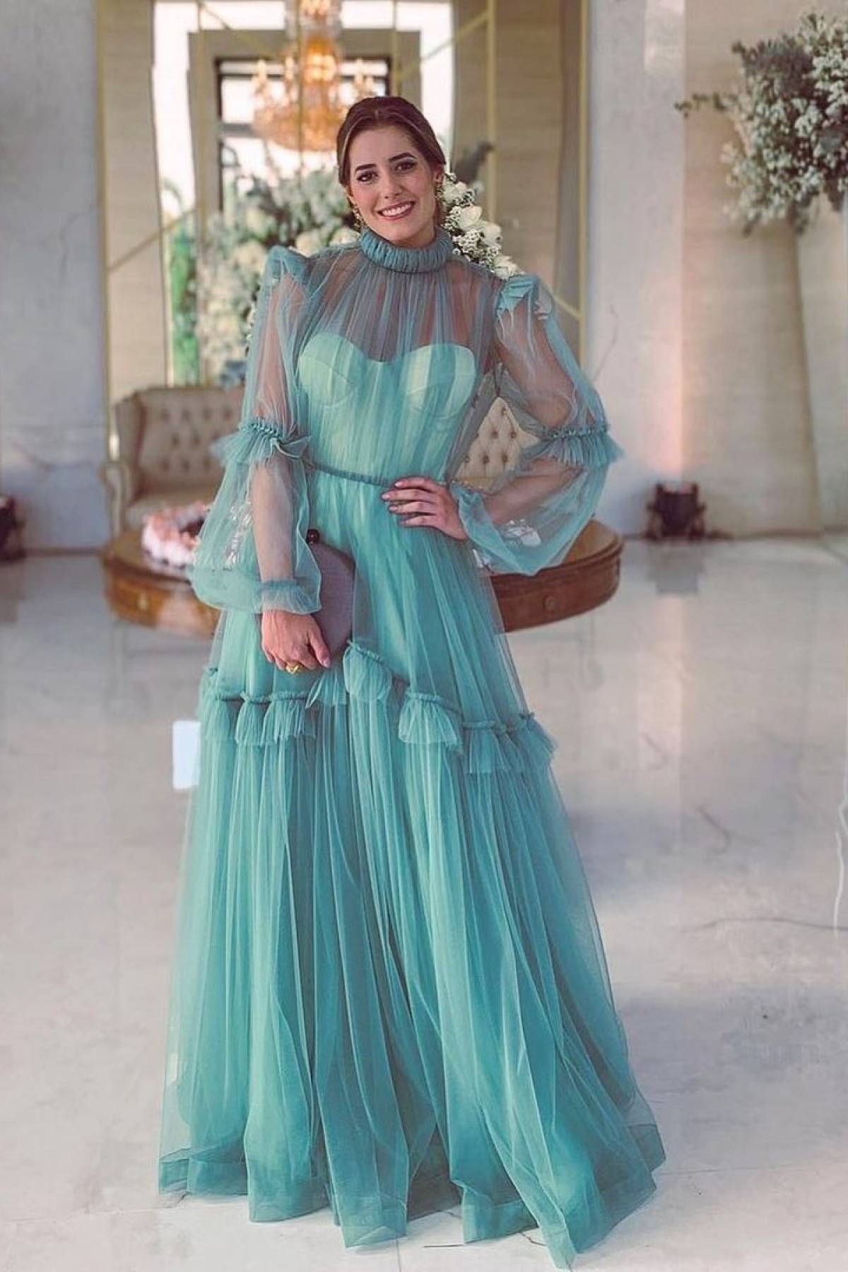 Descrição:Vestido verde menta, de tule com manga longa, gola alta, forro curto, corselet