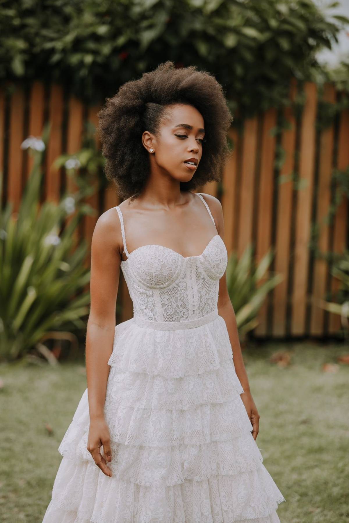 Descrição:Vestido de noiva branco/off, inteiro de renda, busto corselet, saia ampla em camadas