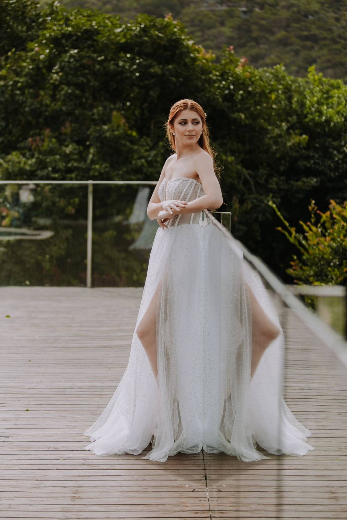 Descrição:Vestido longo de noiva, branco, busto em corset, decote profundo, saia ampla, fenda, brilho composto por strass e glitter