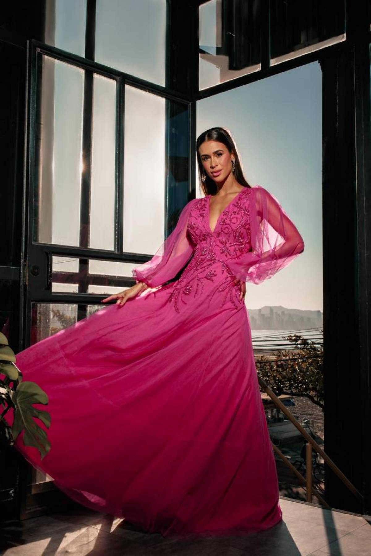 Descrição:Vestido longo pink, manga longa de tule, semi bordado, decote v