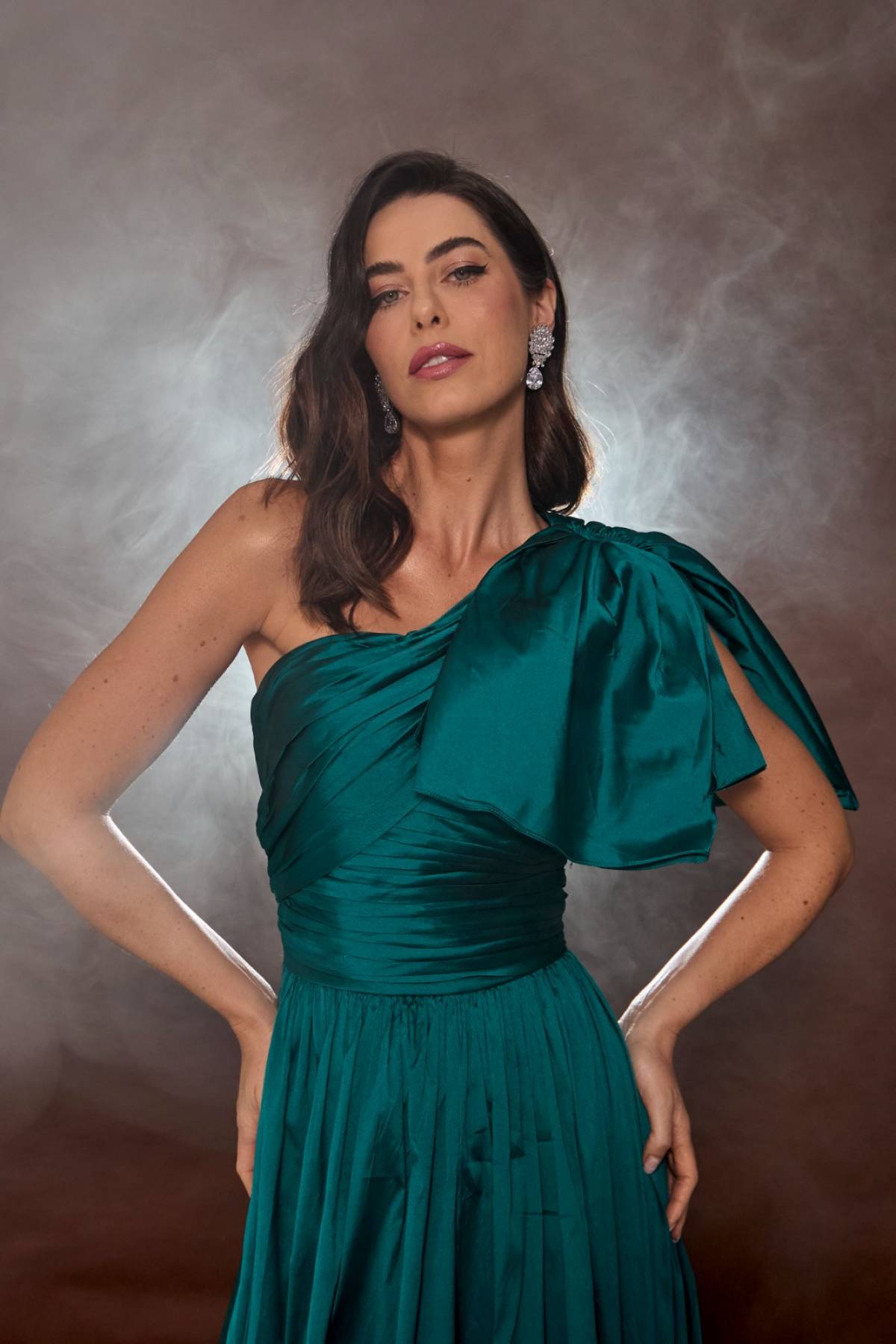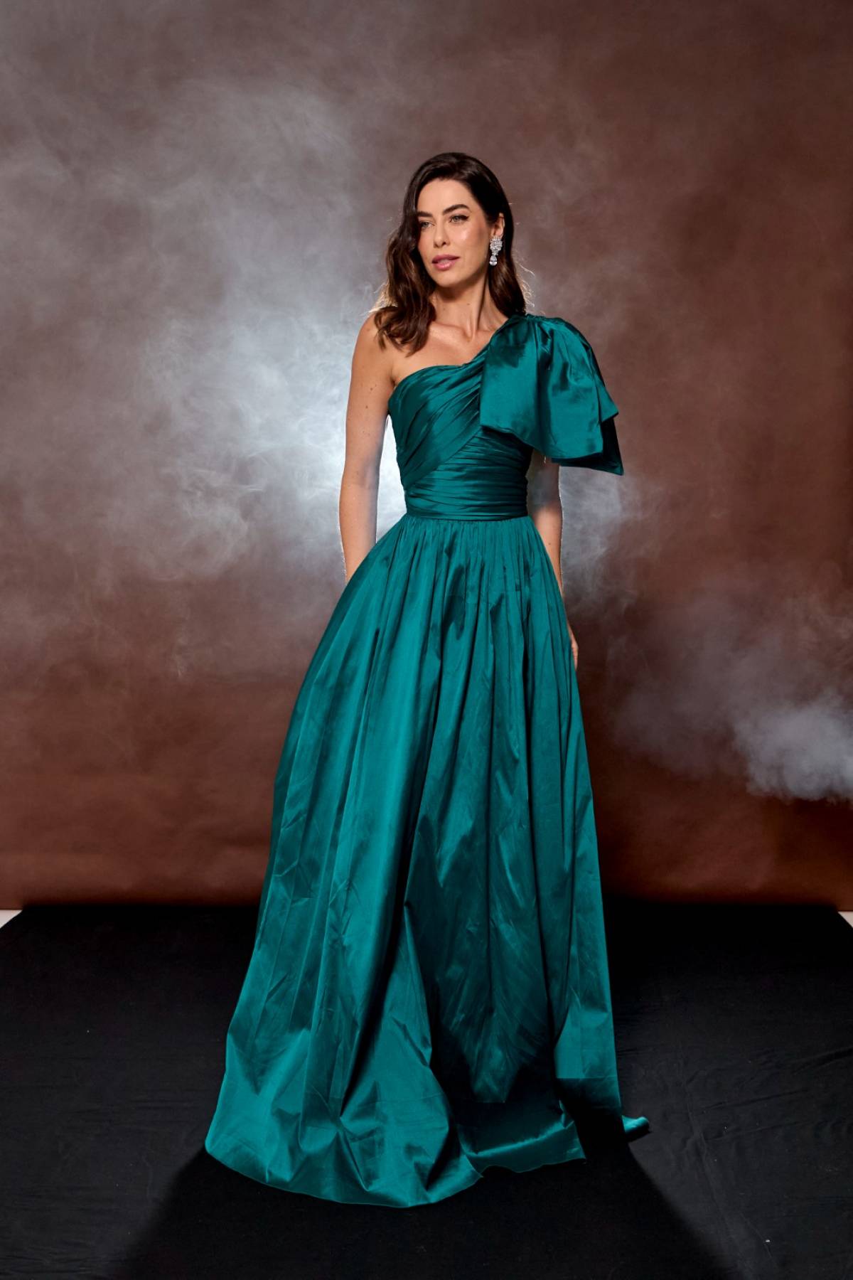 Descrição:Vestido verde esmeralda alfaiataria gode de um ombro só com laço no ombro