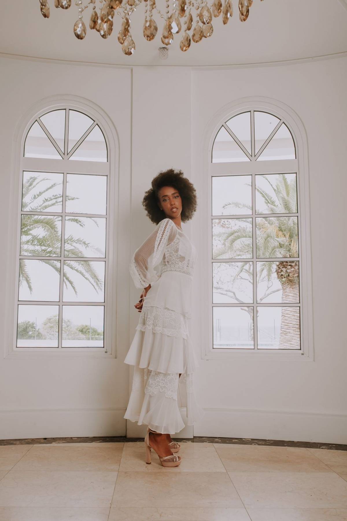 Descrição:Vestido noiva, ombro ombro manga bufante sem fenda, saia em camadas, renda