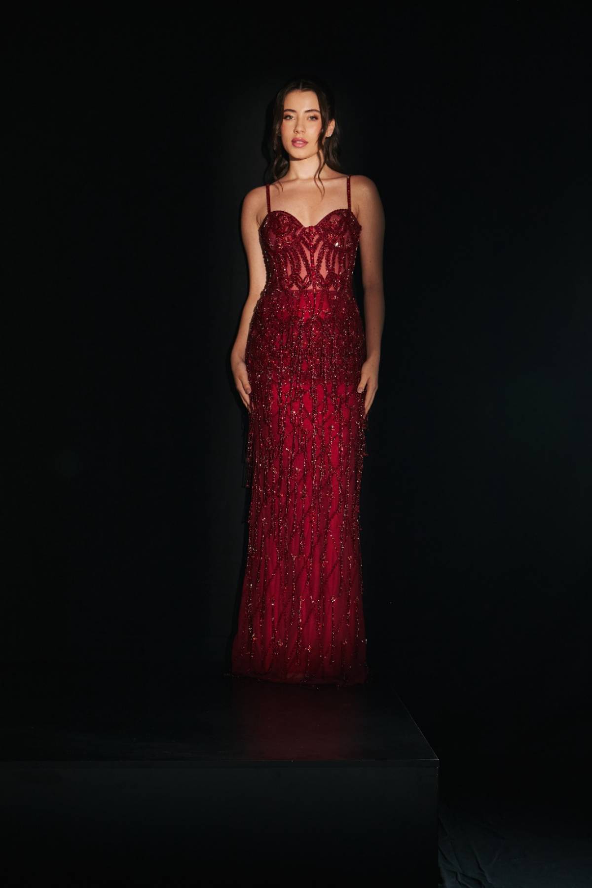 Vestido marsala, inteiramente bordado em pedras com franjas