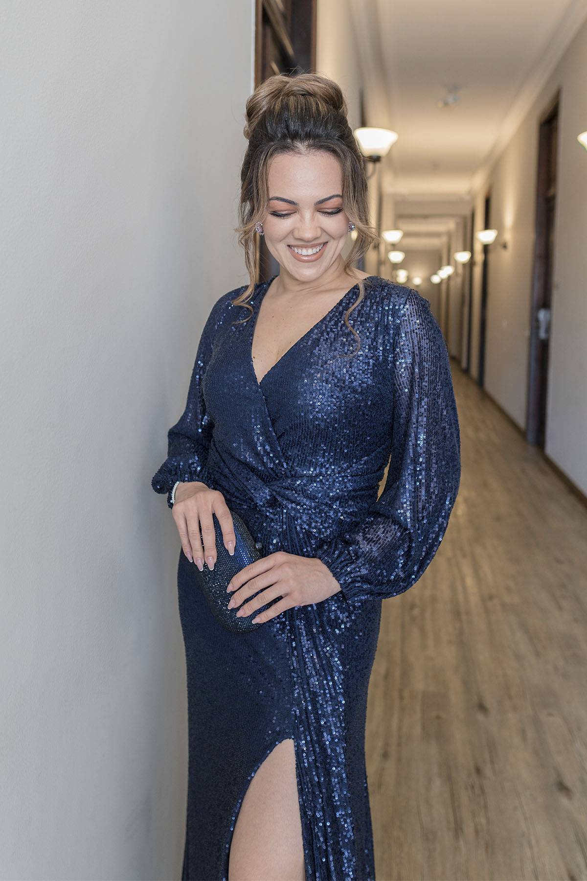 Descrição:Vestido azul de paetês, com fenda e mangas longas.
