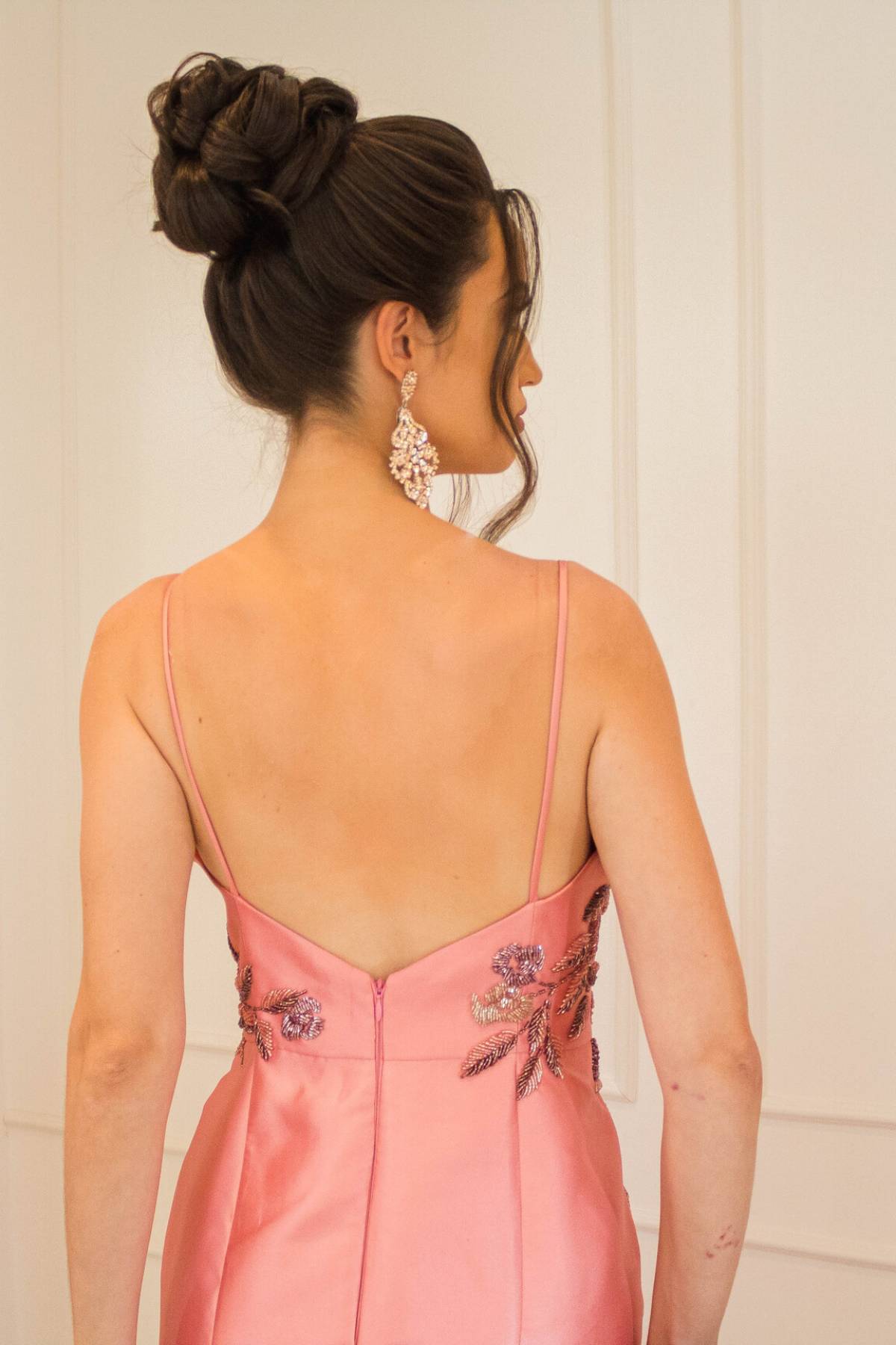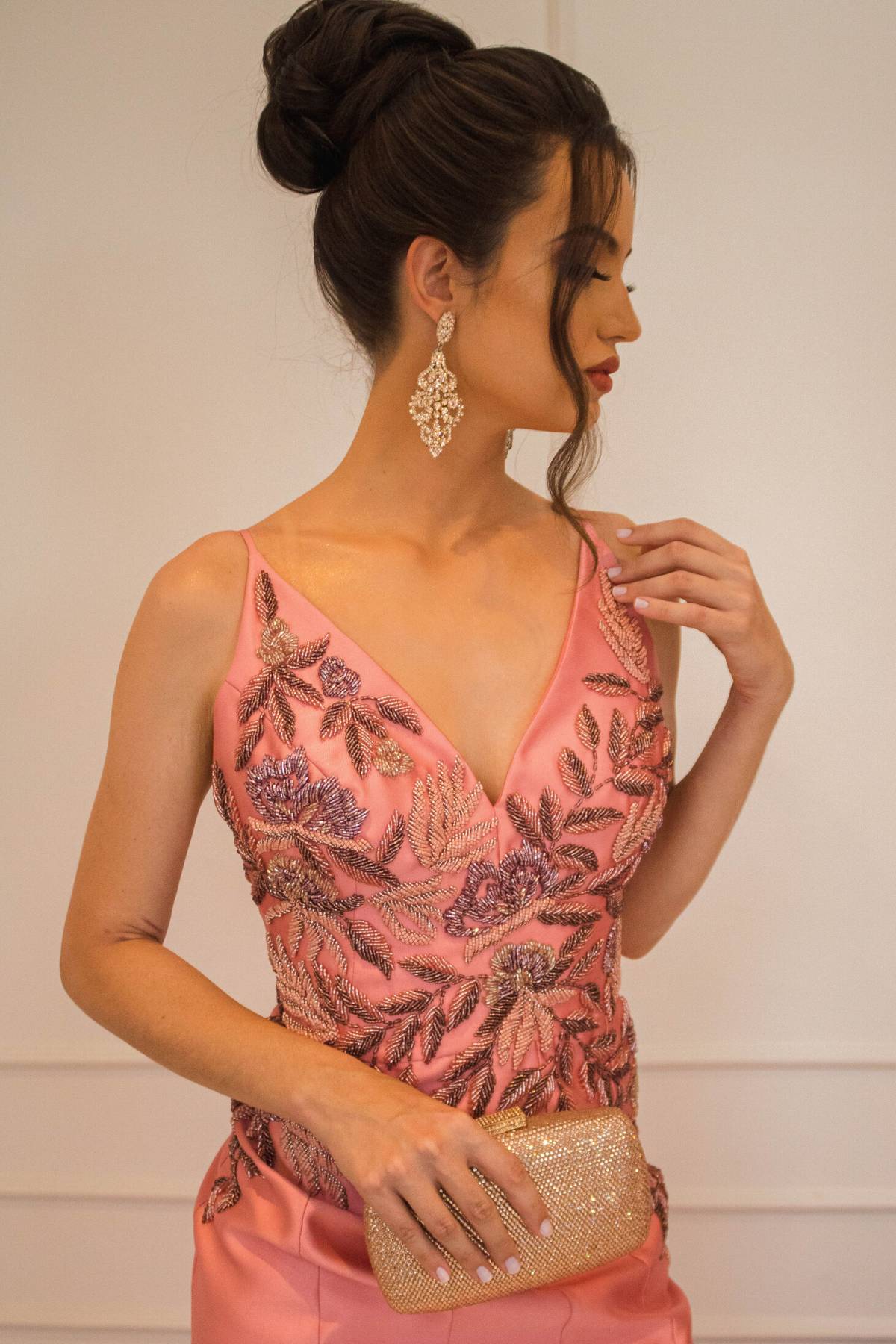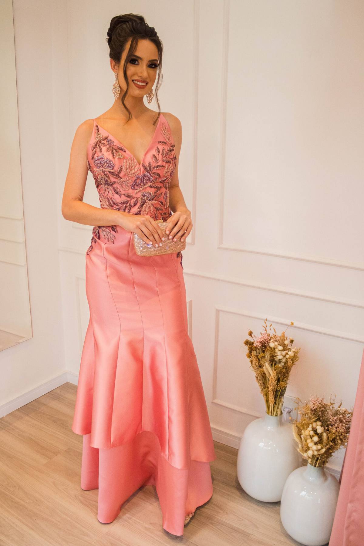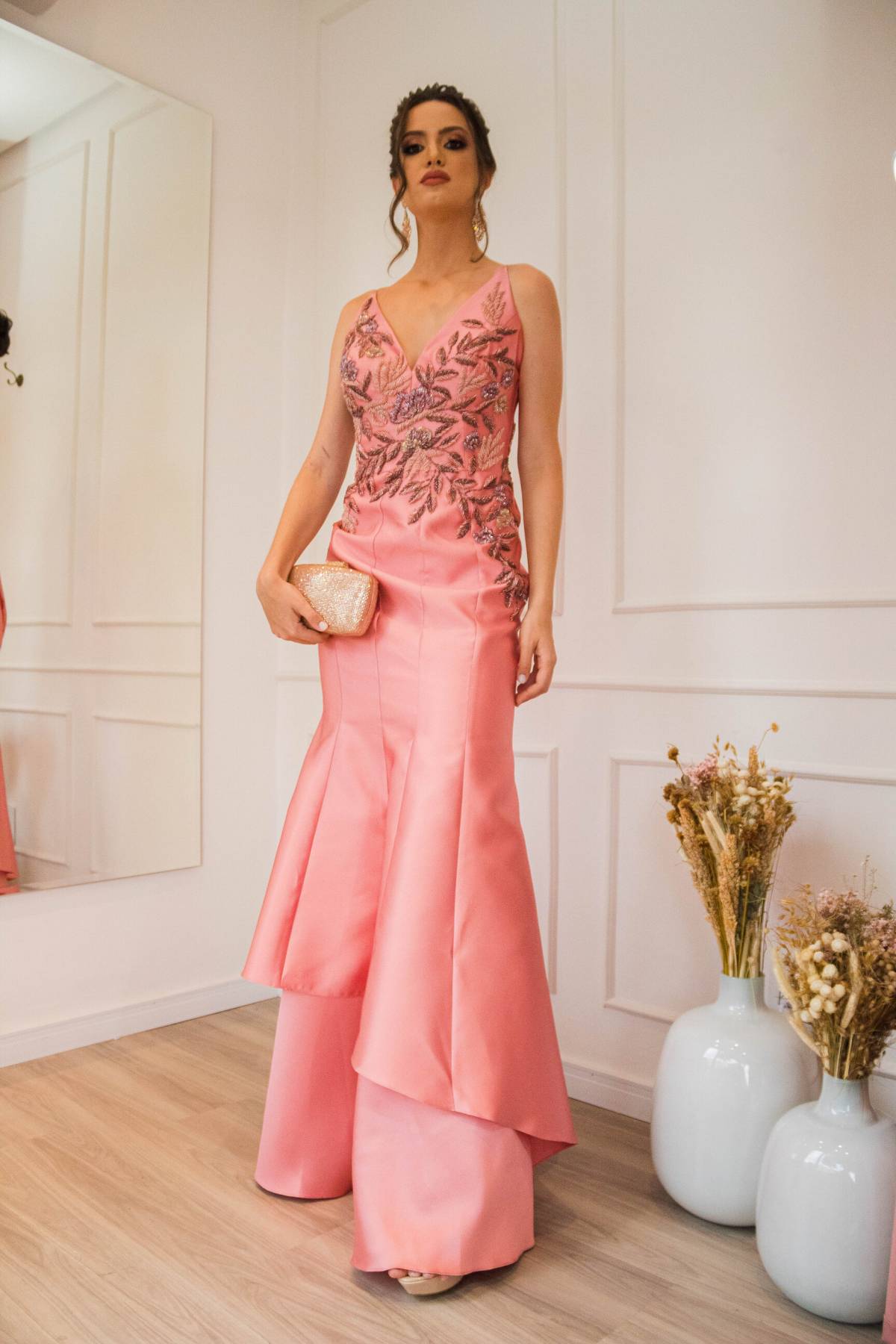 Descrição: vestido rosé de alfaiataria semi bordado salmão/ rosé com saia em camadas sereia