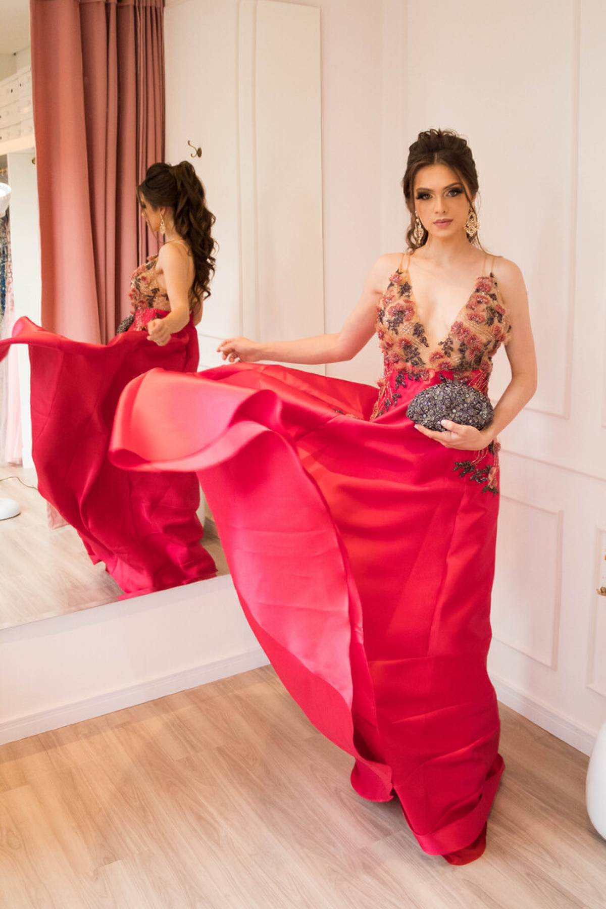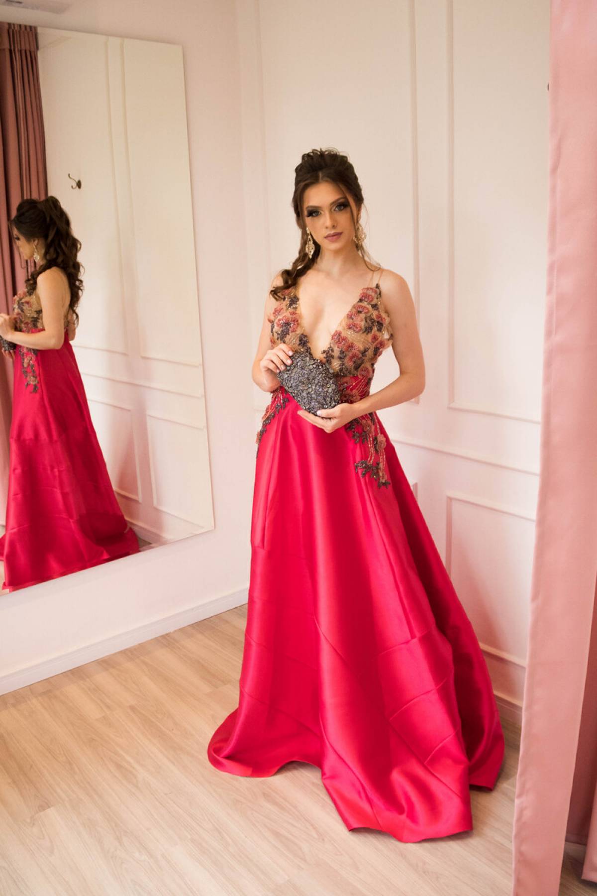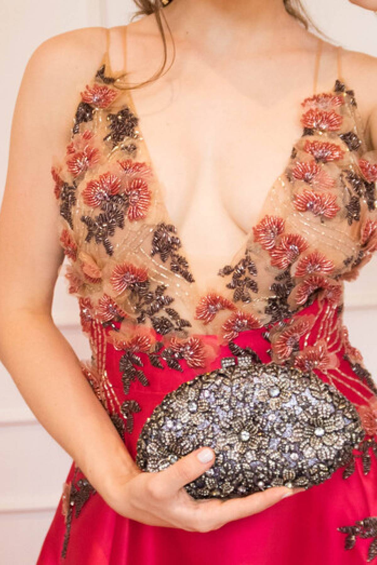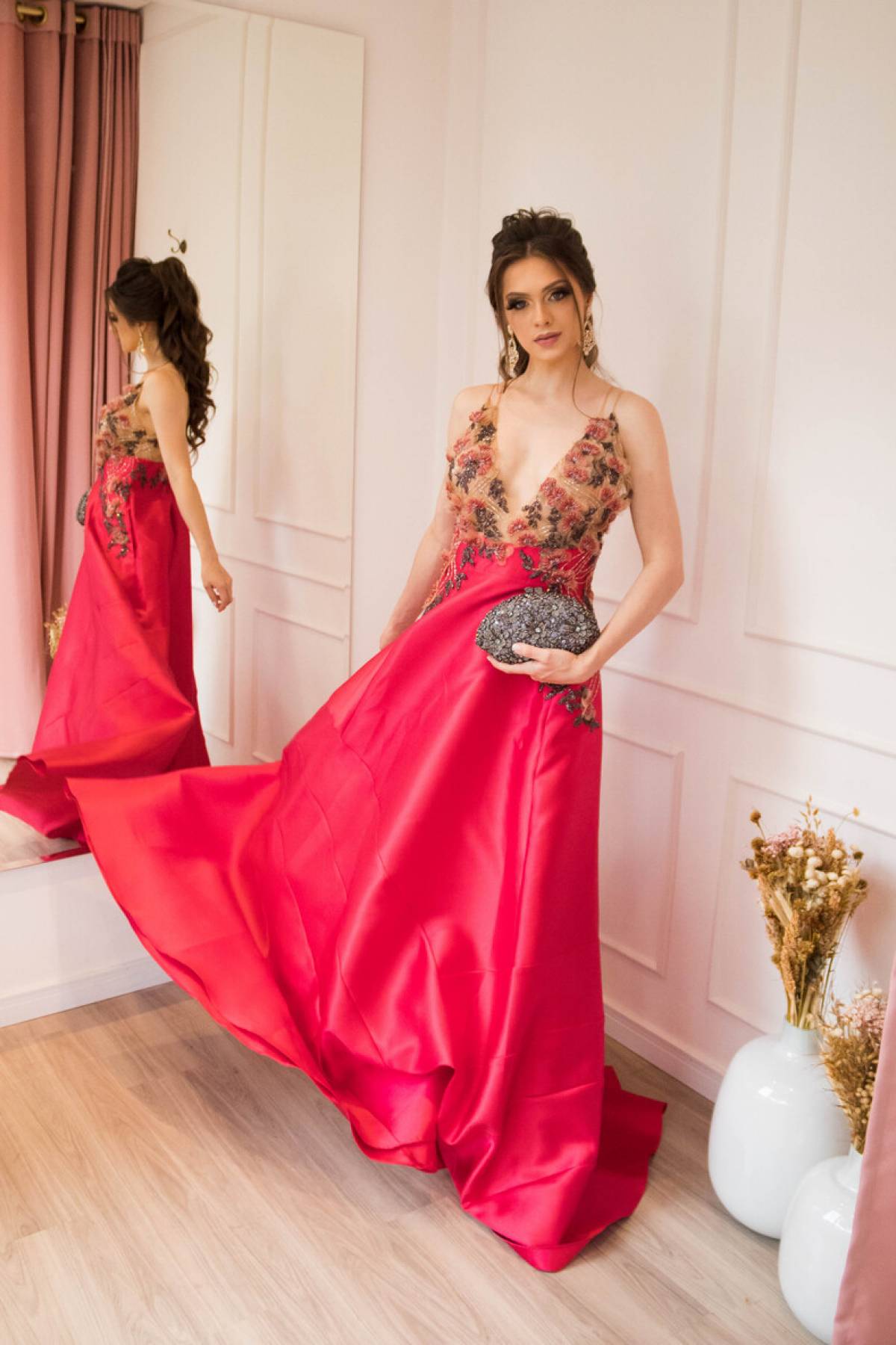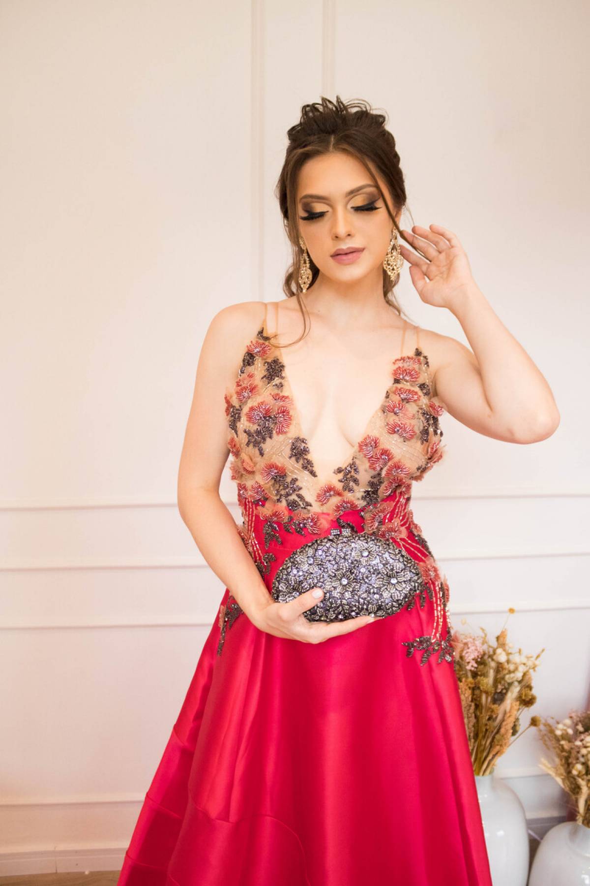 vestido longo semi bordado em chumbo com flores em 3D, em alfaiataria com bolso