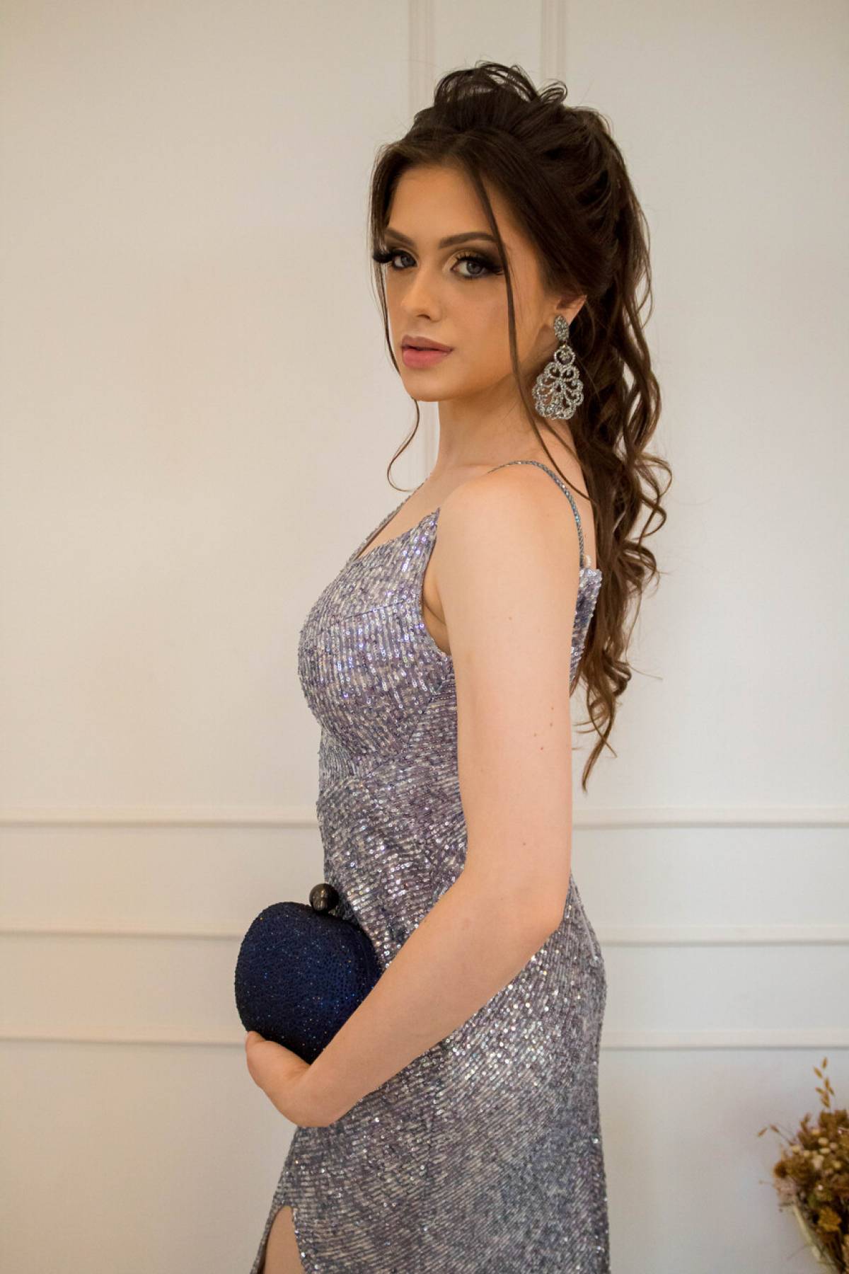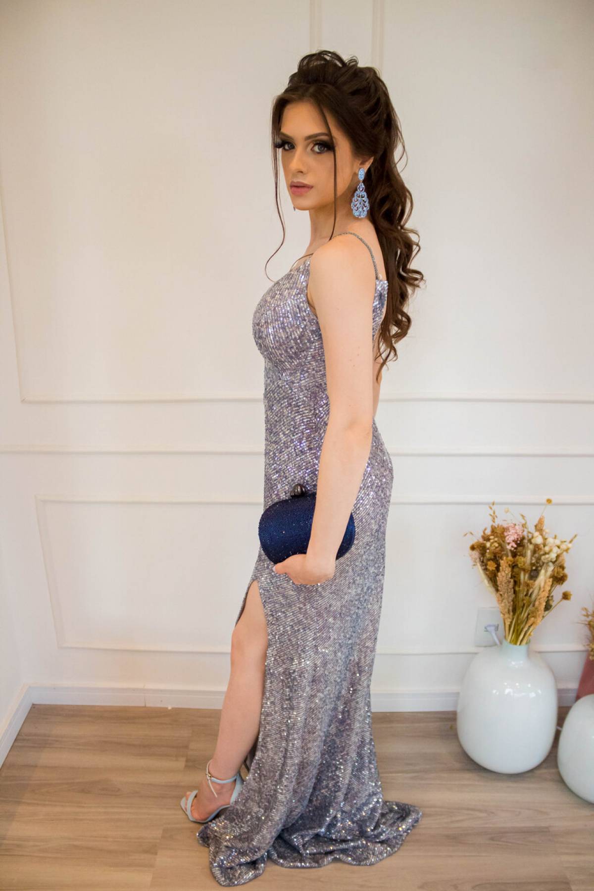 Descrição:Vestido longo prata com azul, com decote e fenda na perna