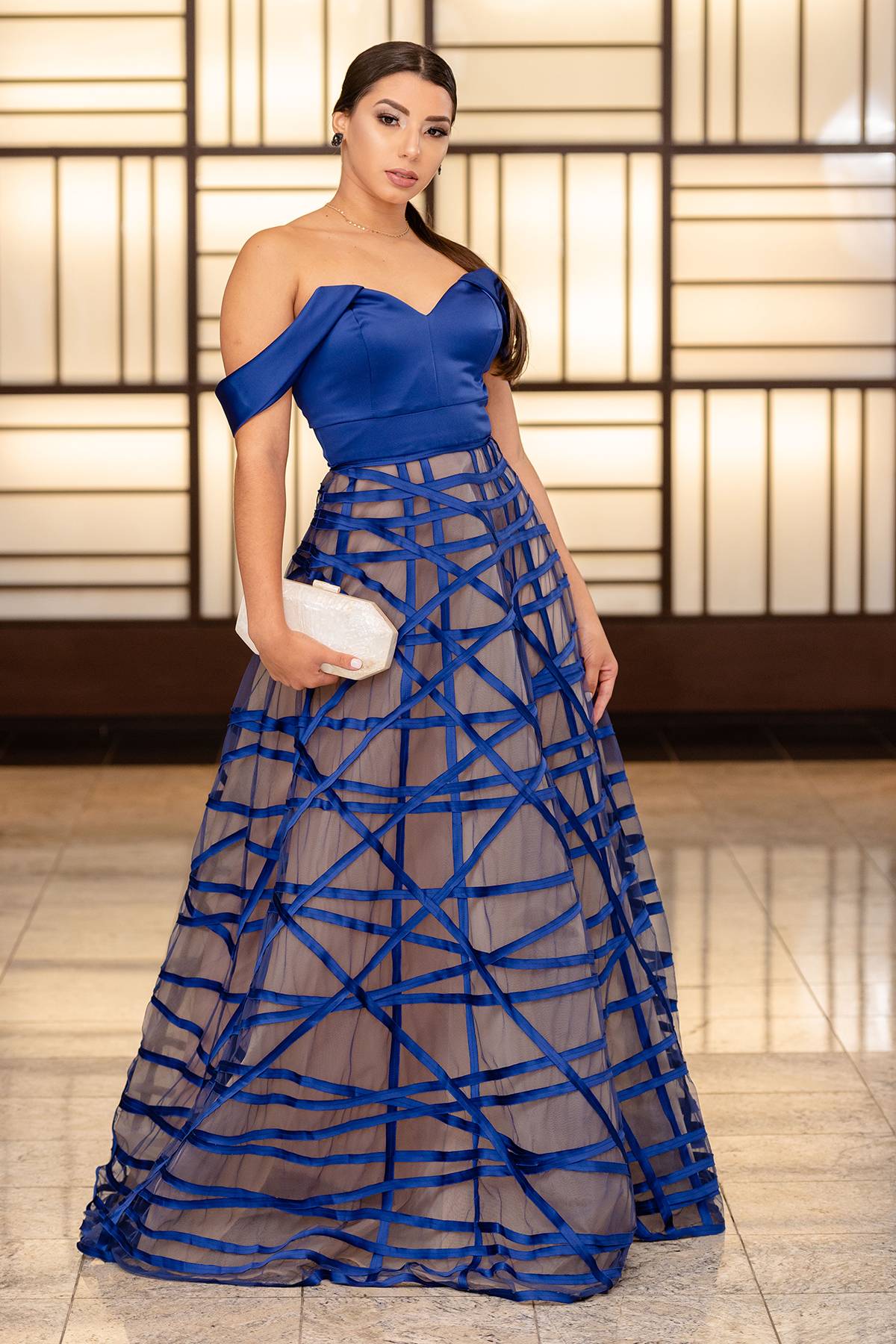 Descrição:Vestido azul estruturado em saia de crinol com fitas de cetim duchese.