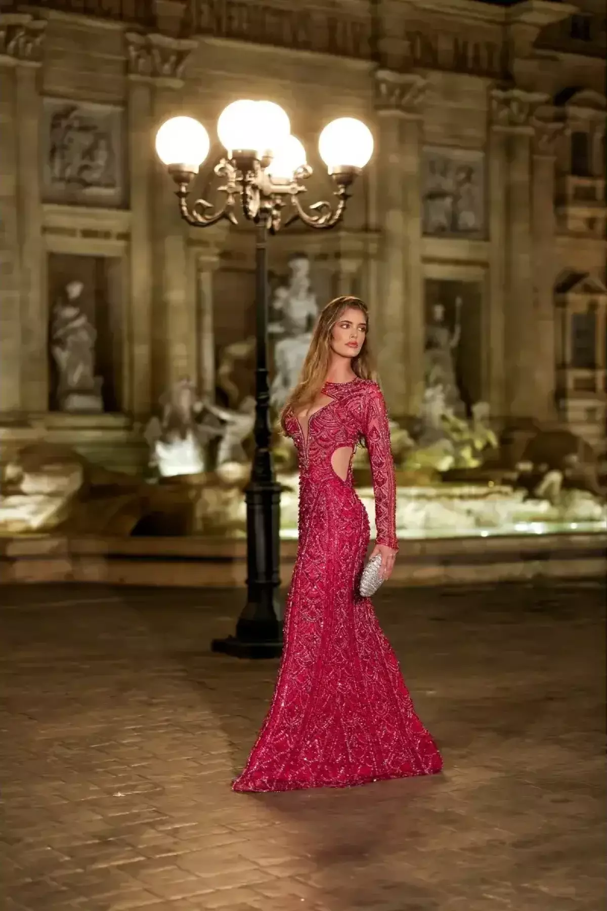 Descrição:Vestido longo em tule rose com brilhos, babados em camadas e decote profundo V.