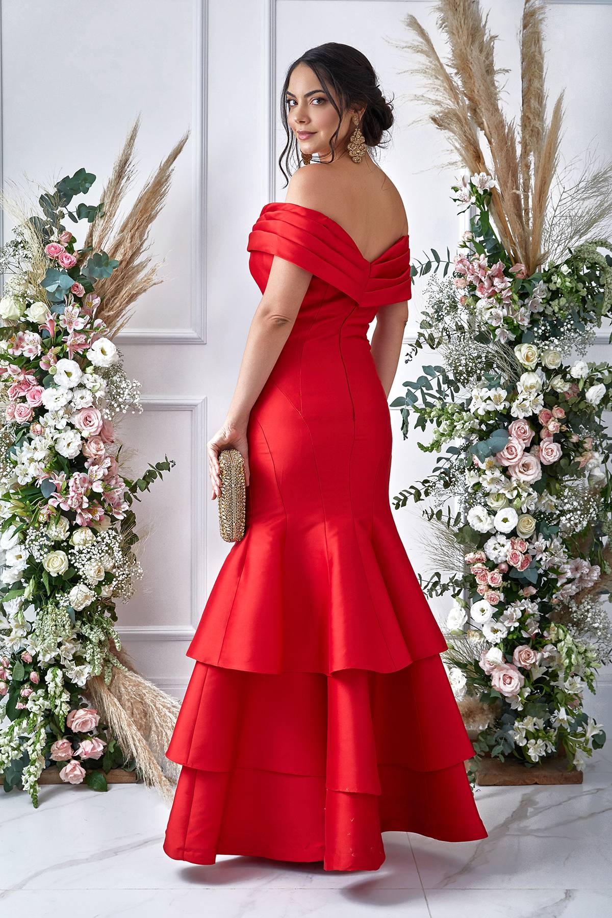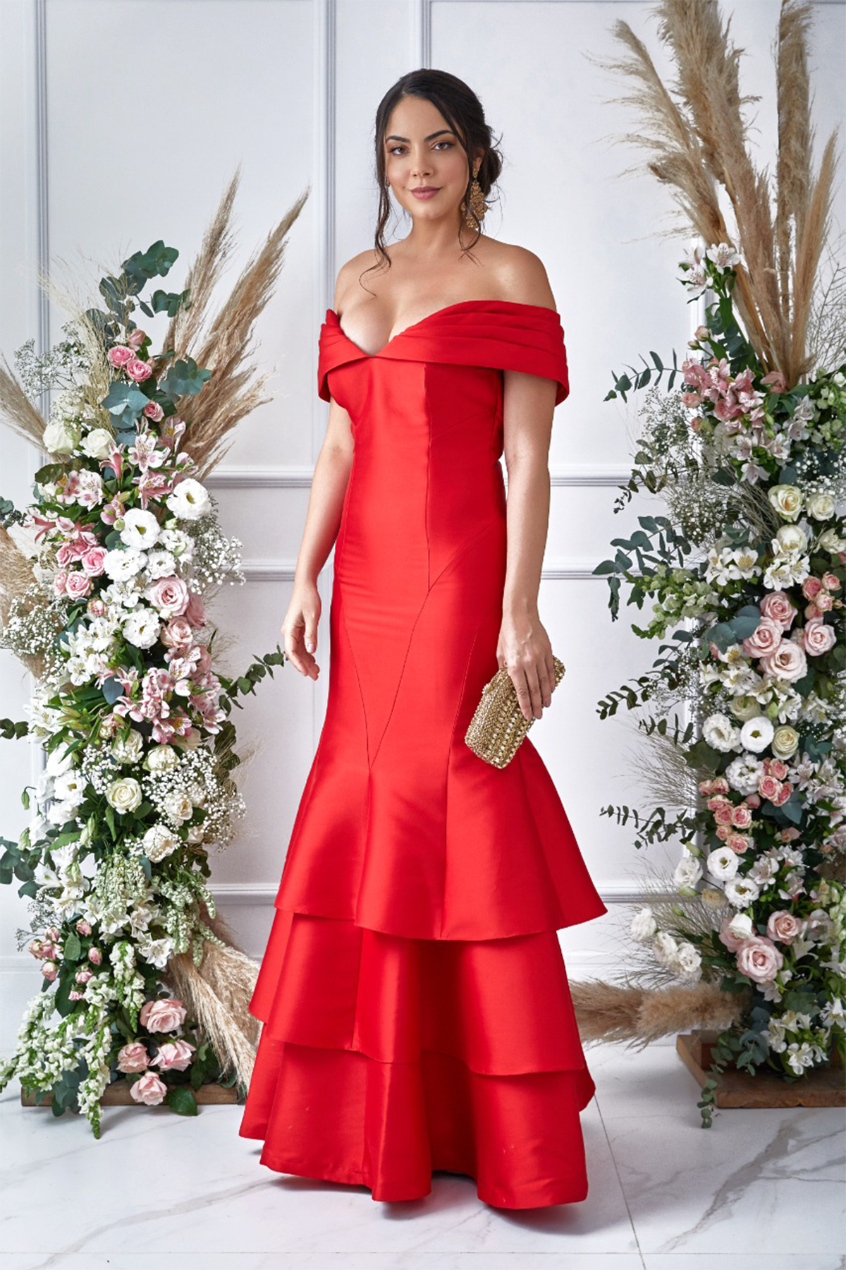 Descrição:Vestido longo alfaiataria vermelho com decote ombro a ombro e barra com babados em camadas.