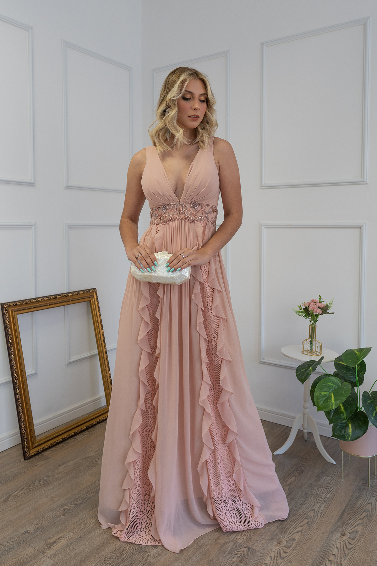 Descrição:Vestido longo liso rosê com detalhe bordado na cintura, nesgas com rendas e babados.