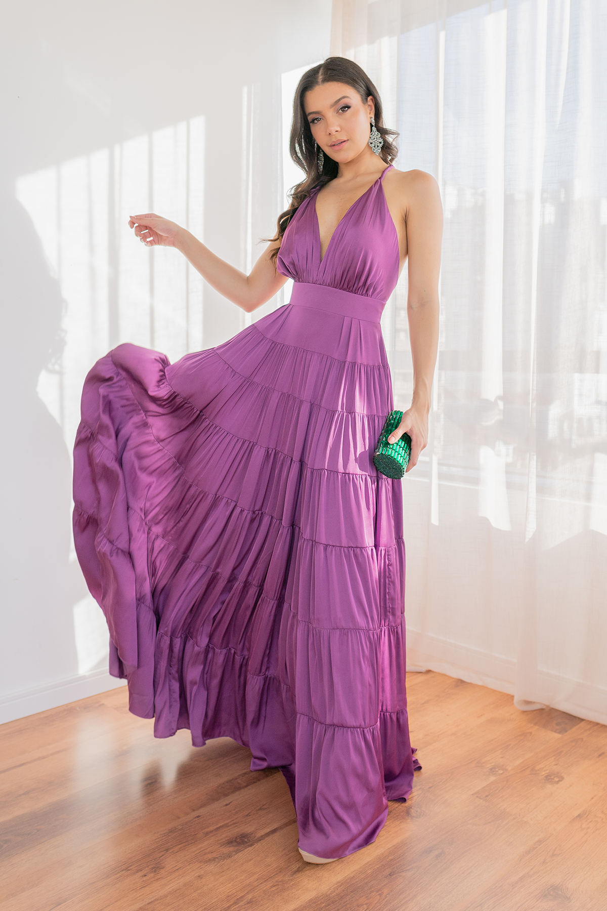 Descrição:Vestido longo roxo, com alças em x nas costas.