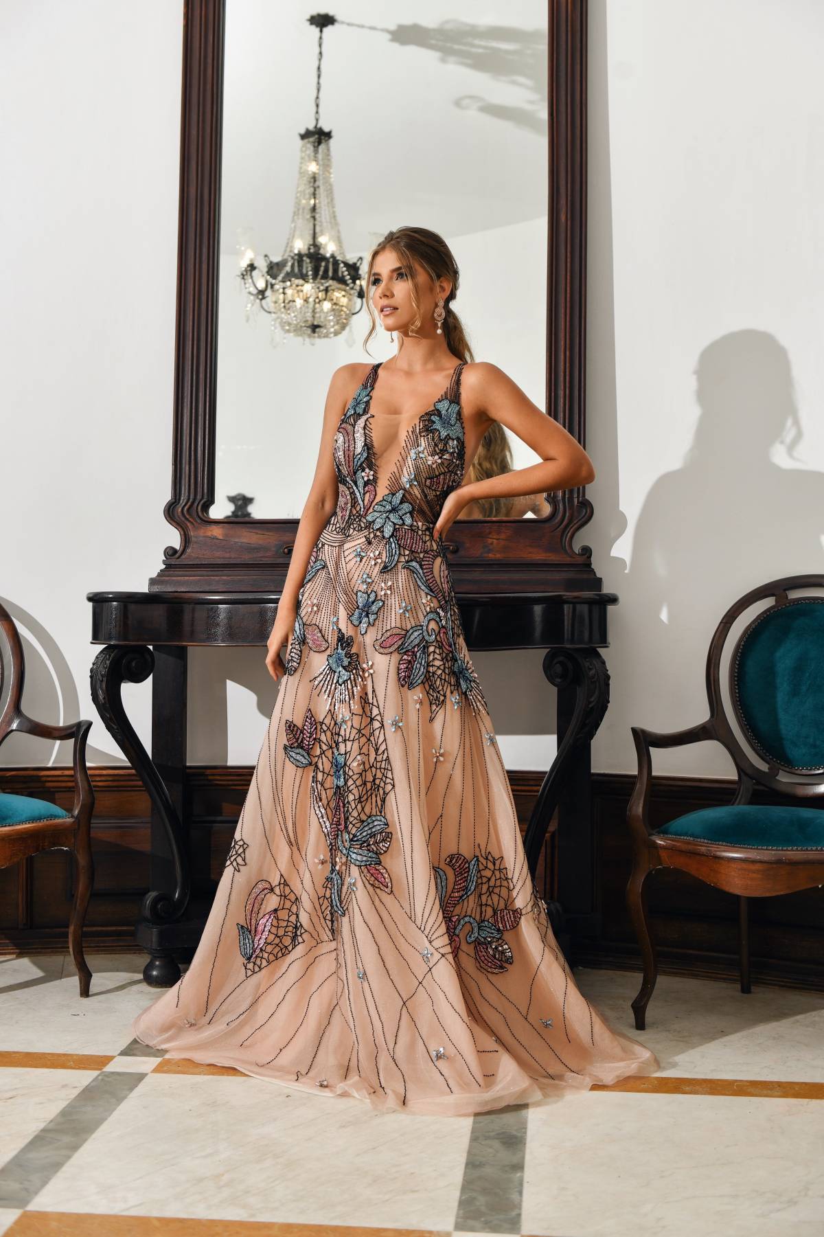 Descrição:Vestido em bordados rose e prata, frente única