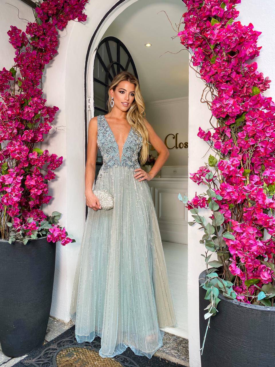 Descrição:Vestido longo estilo princesa todo bordado azul claro com busto em flores e saia de crinol.