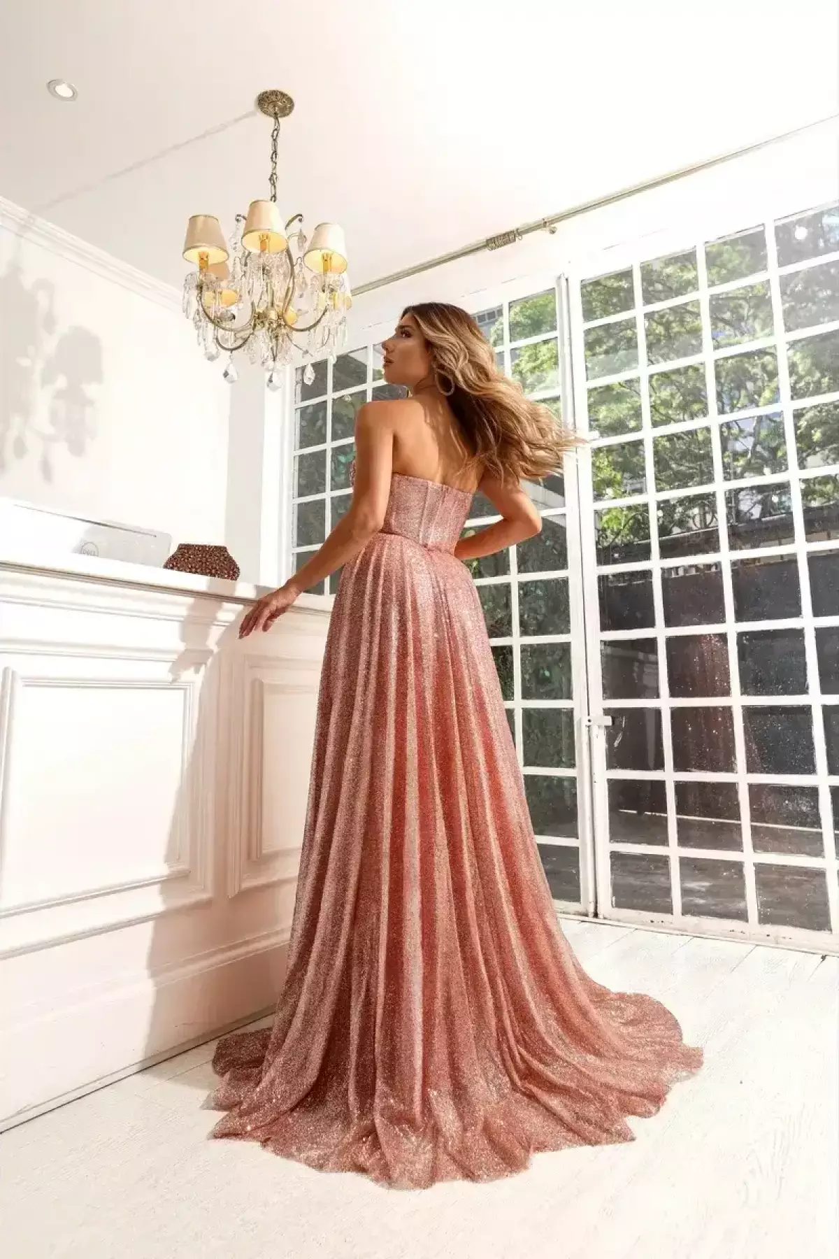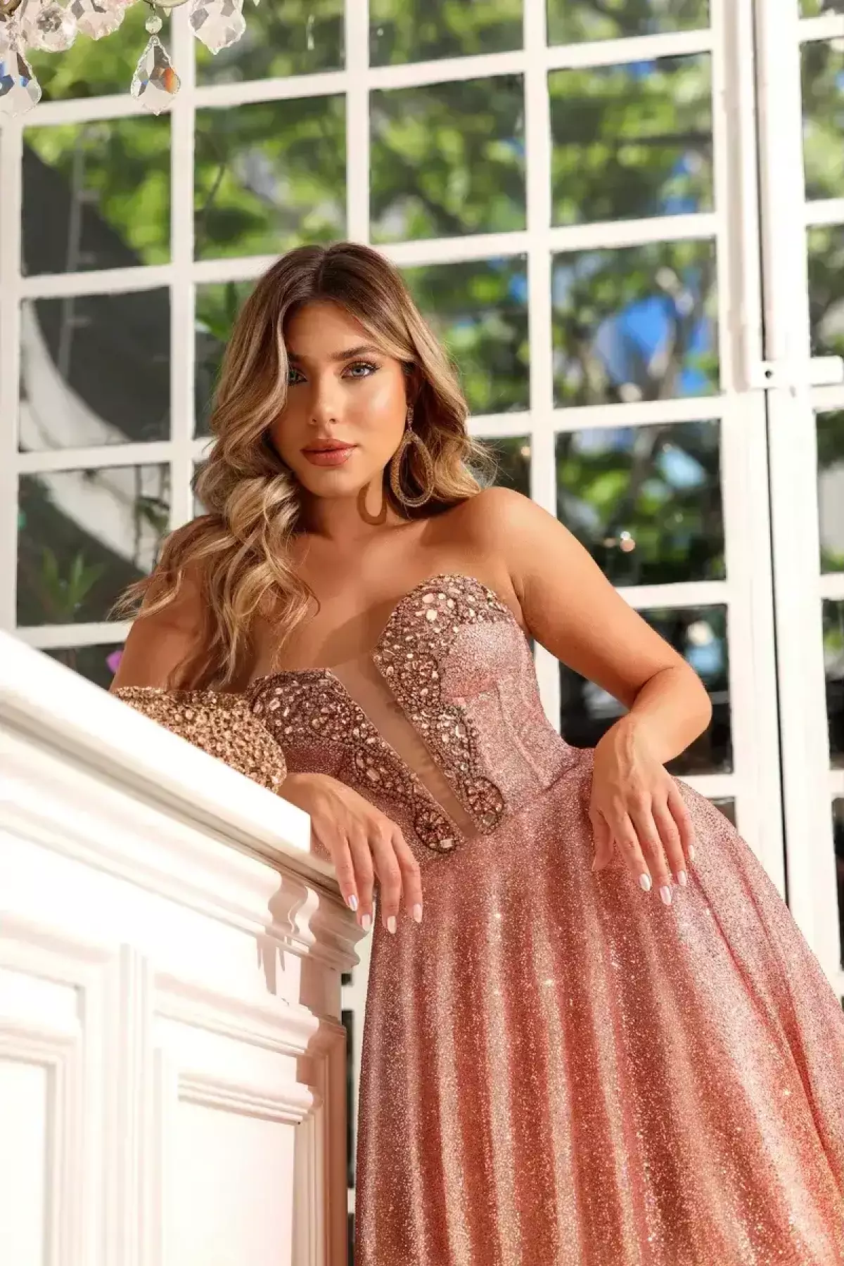 Descrição:Vestido rose gold, tomara que caia com corset, estilo princesa, todo em glitter rose com pedrarias bordadas no busto.