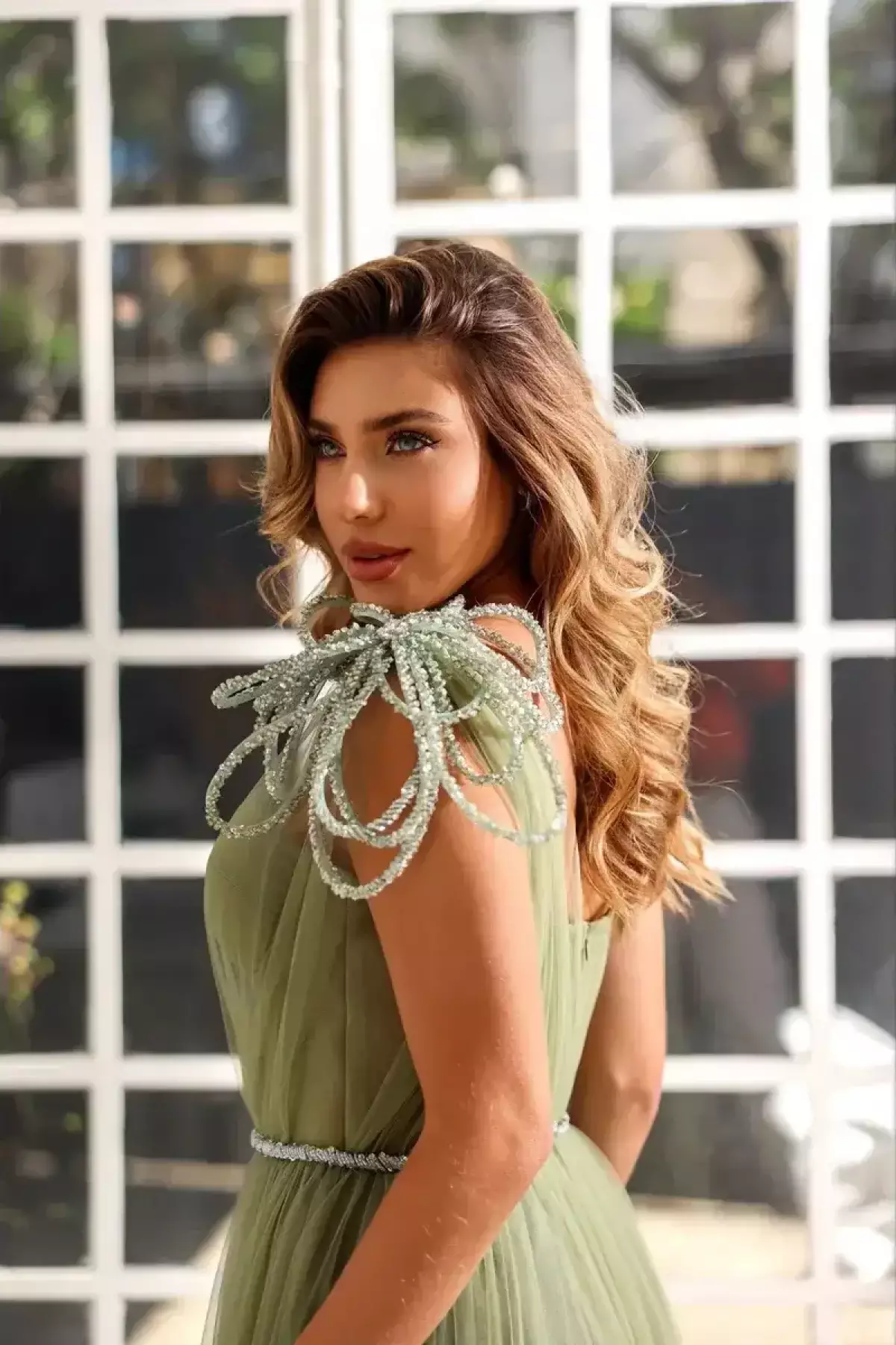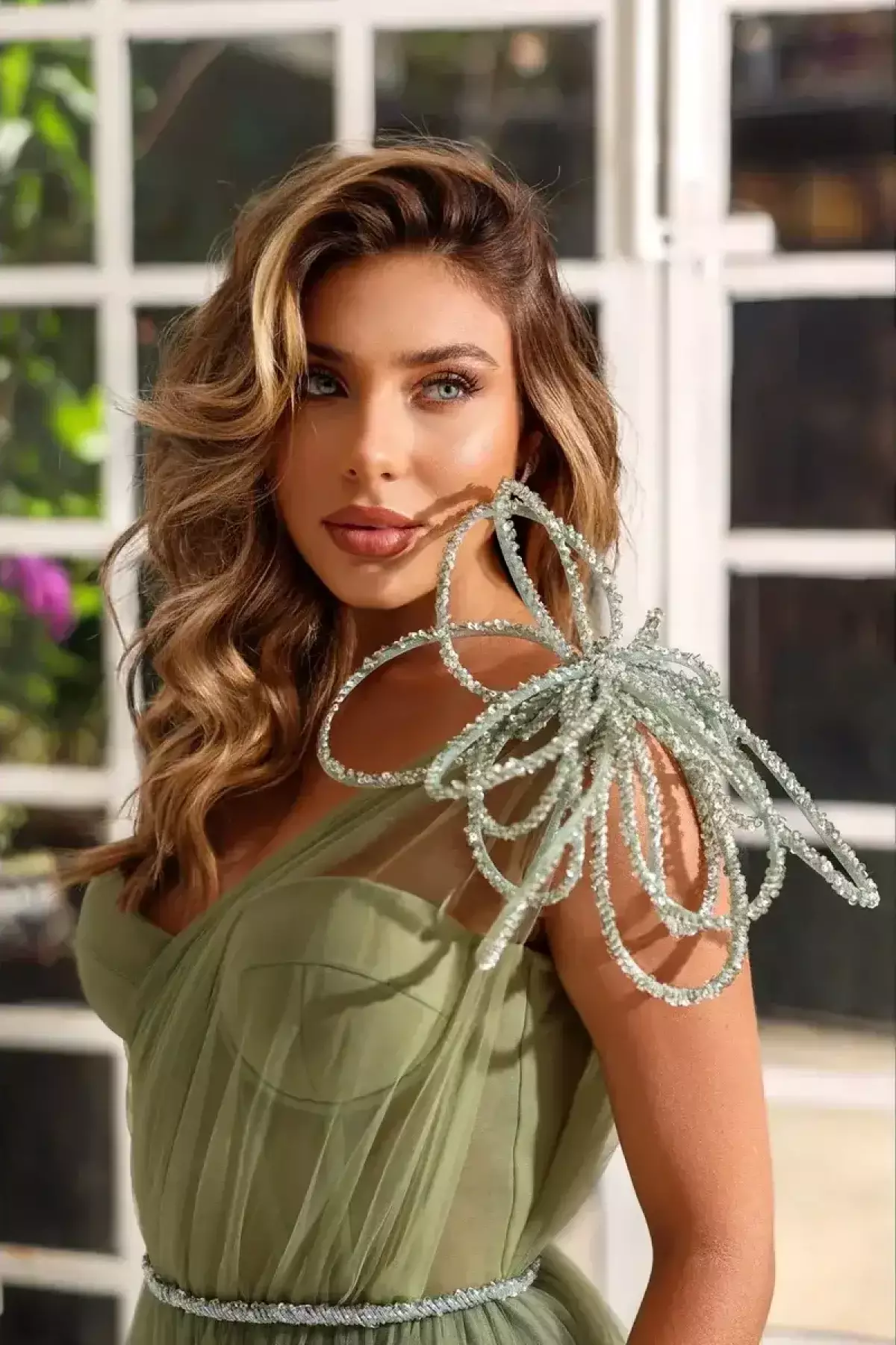 Descrição:Vestido em tule verde oliva, com corpete, cinto e detalhe no ombro bordados.