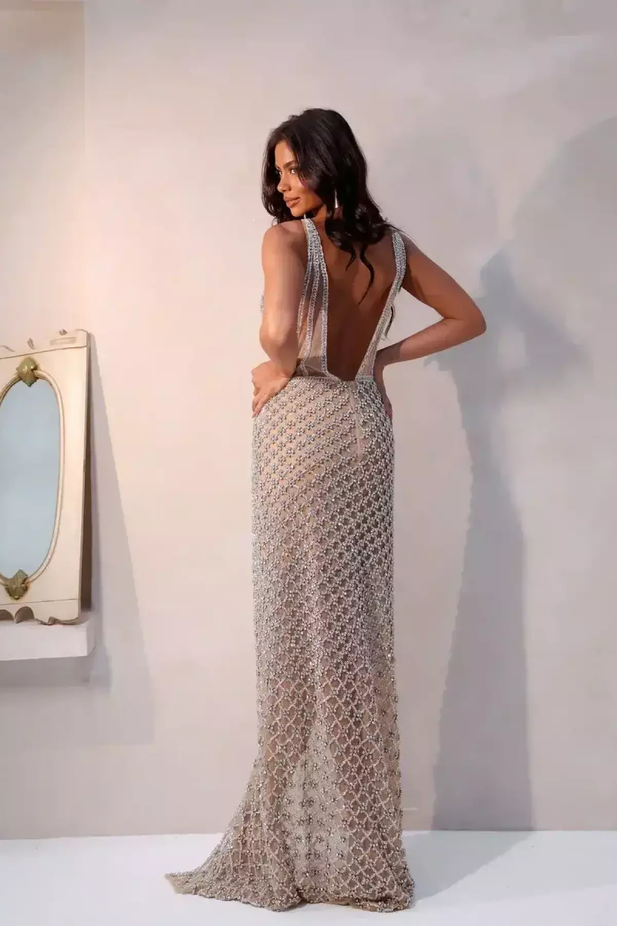 Descrição:Vestido prata todo em pedraria swaroviski e fenda lateral.