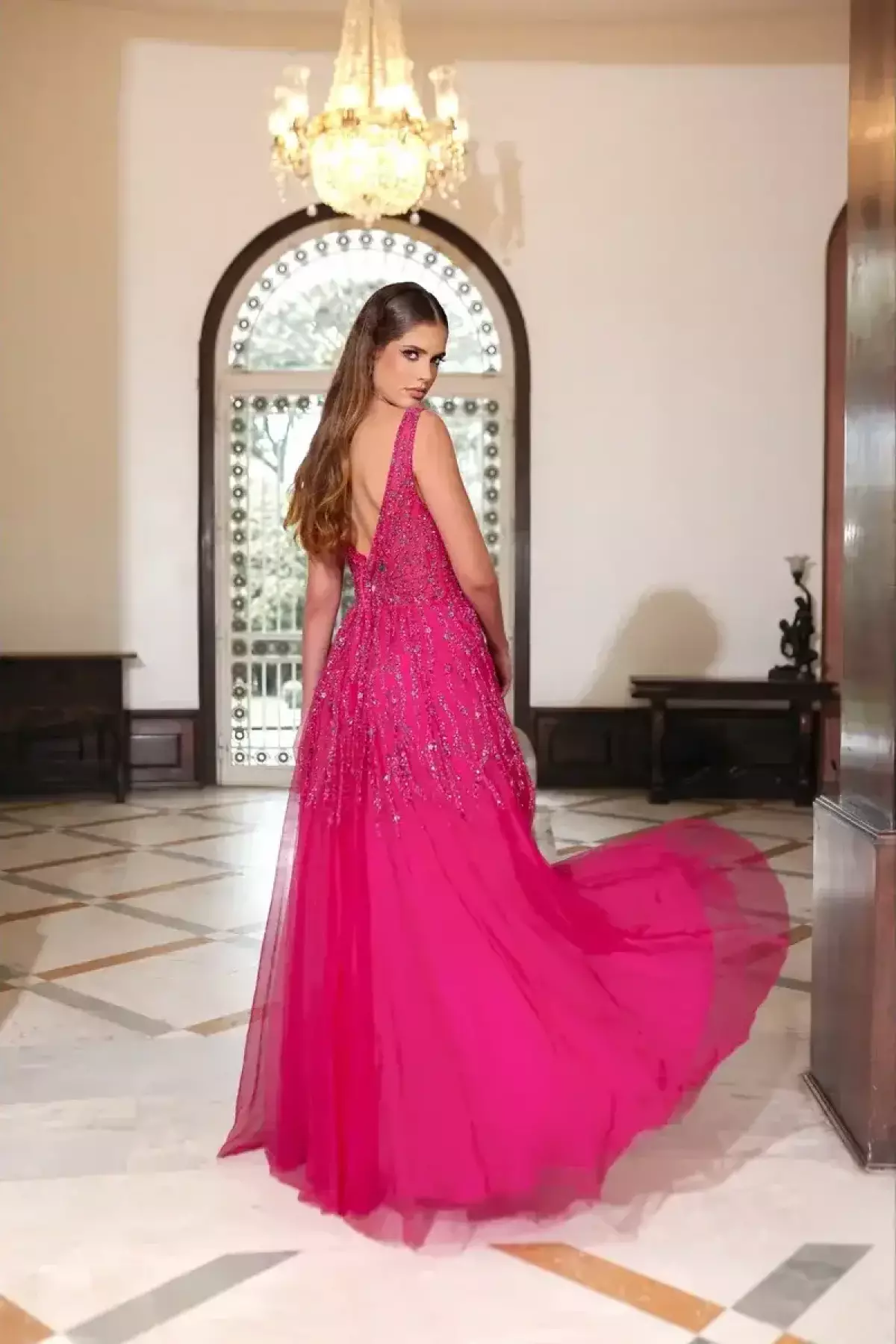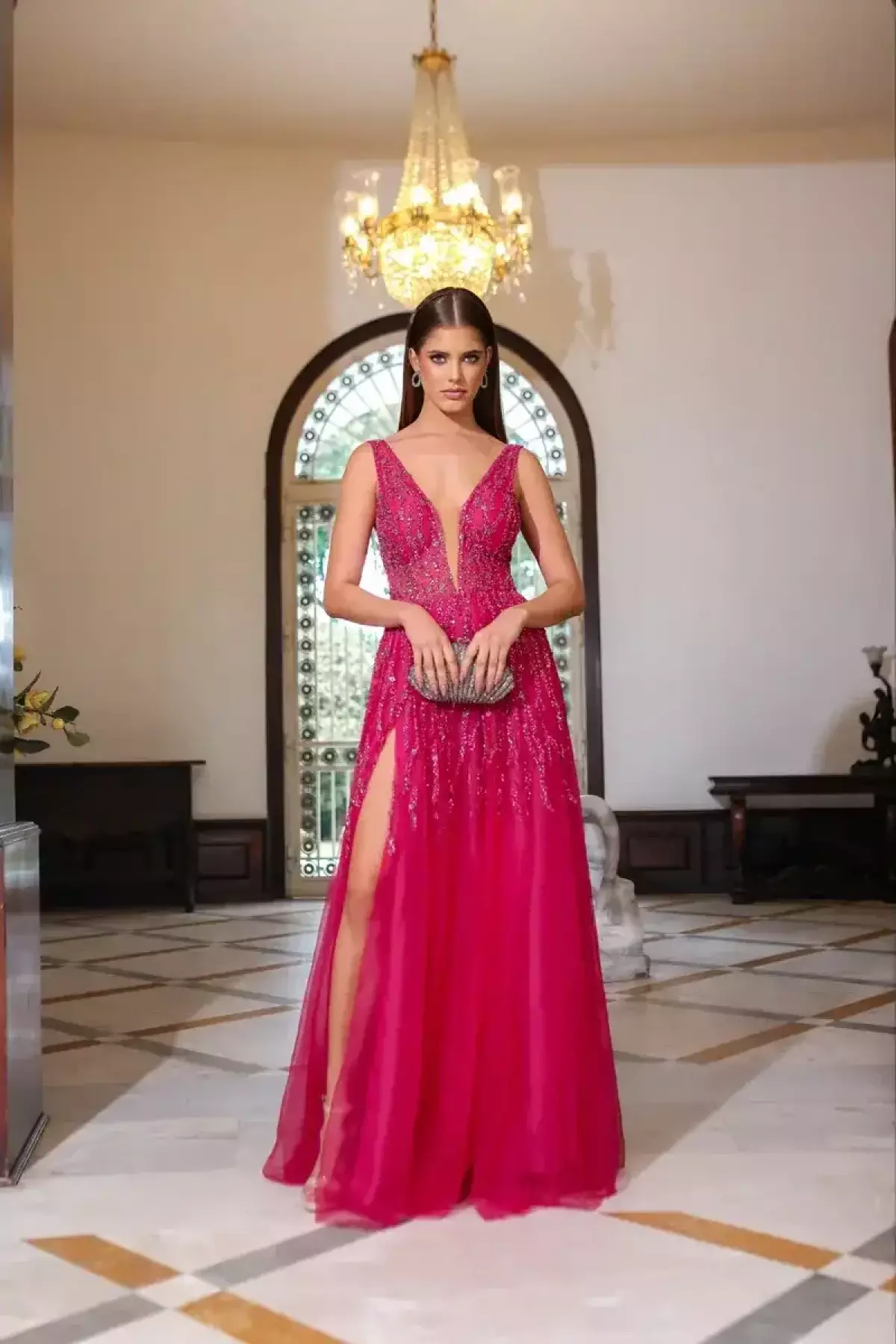 Descrição:Vestido longo pink bordado de tule com decote profundo