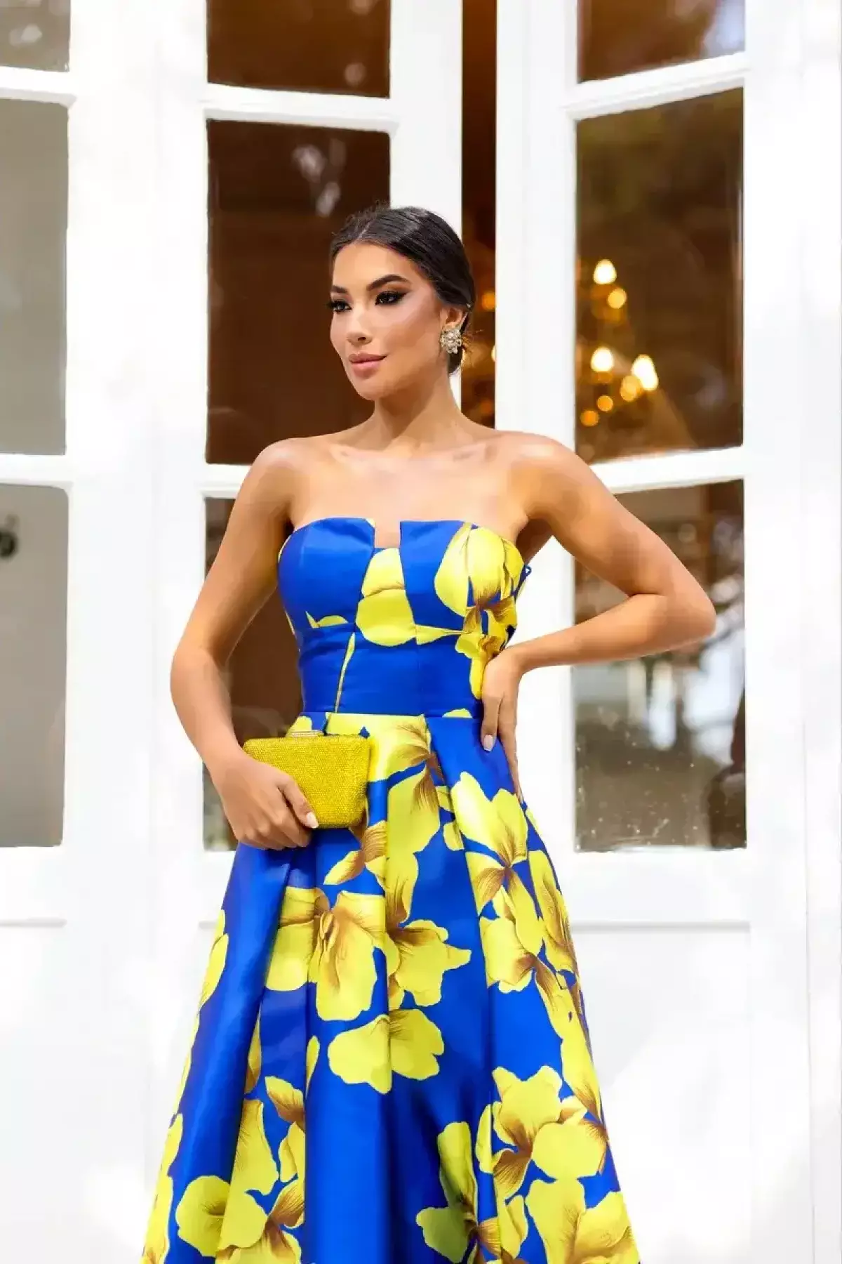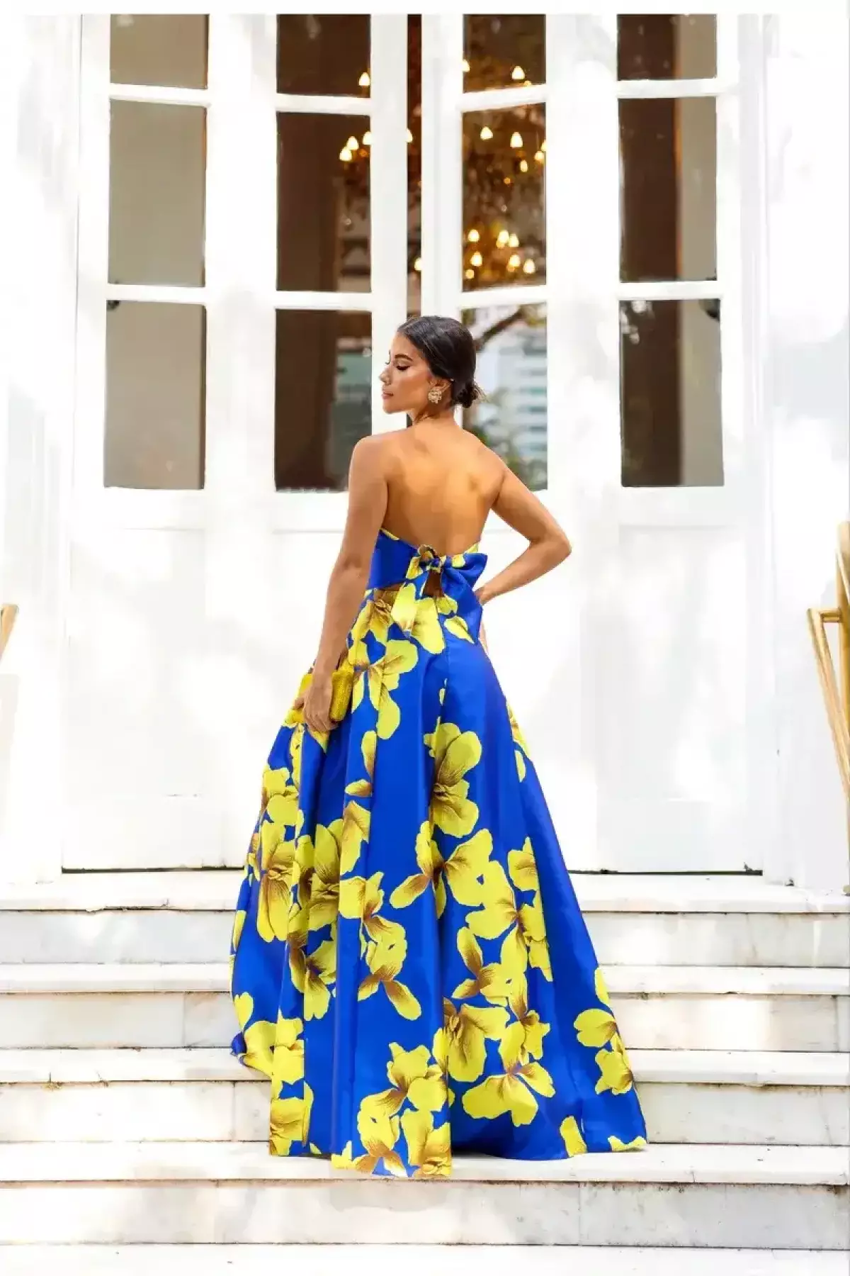 Descrição:Vestido longo azul de alfaiataria, tomara que caia com estampa de flor em amarelo.