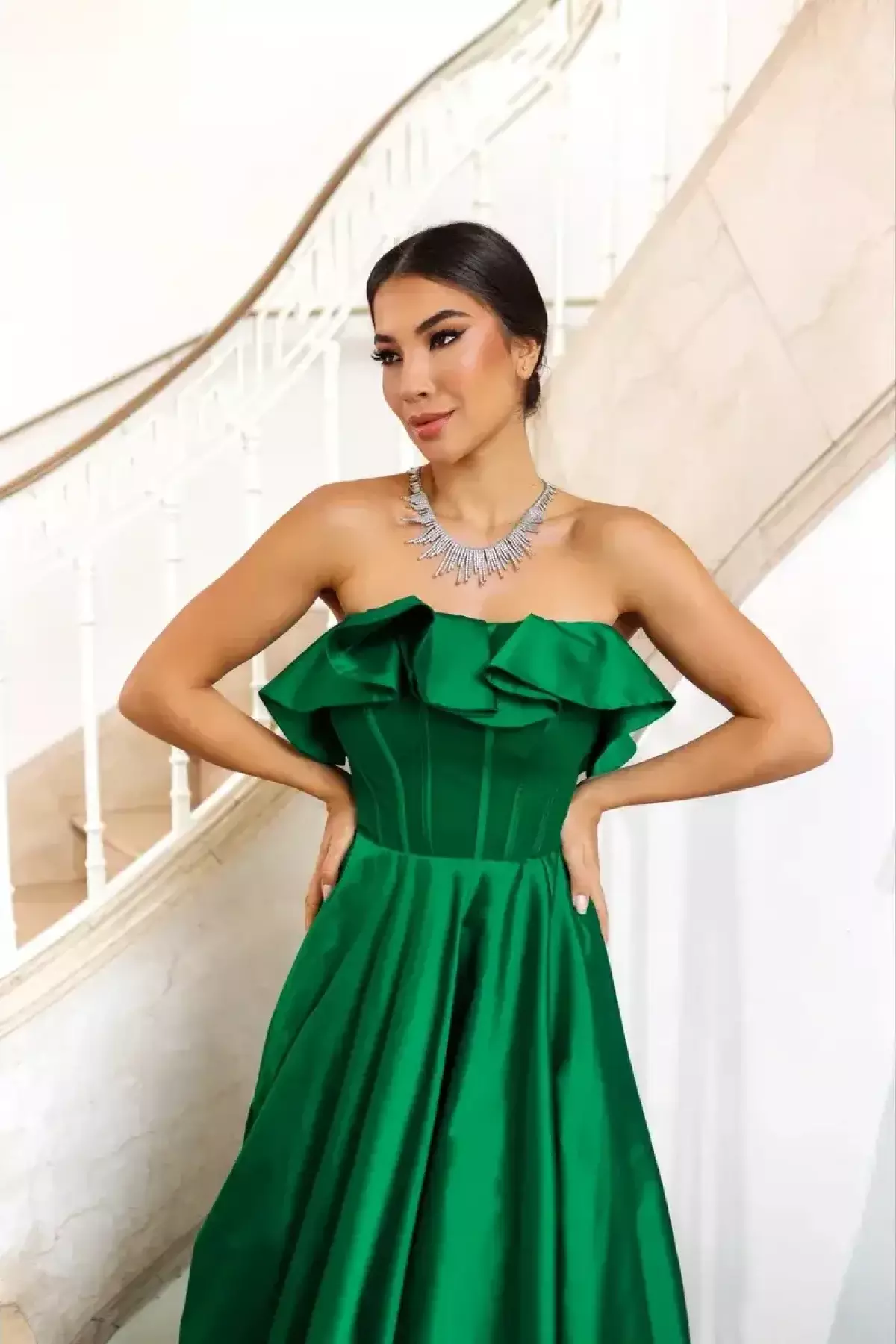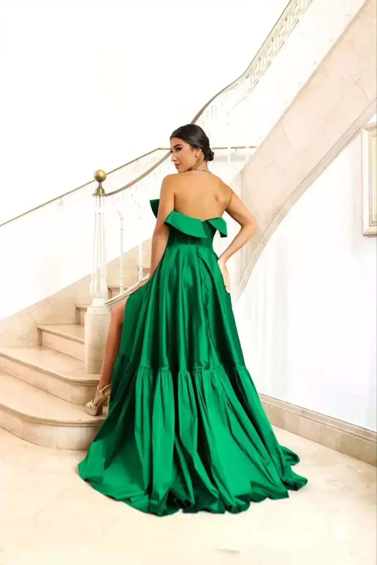 Descrição:Vestido longo verde esmeralda tomara que caia com fenda.