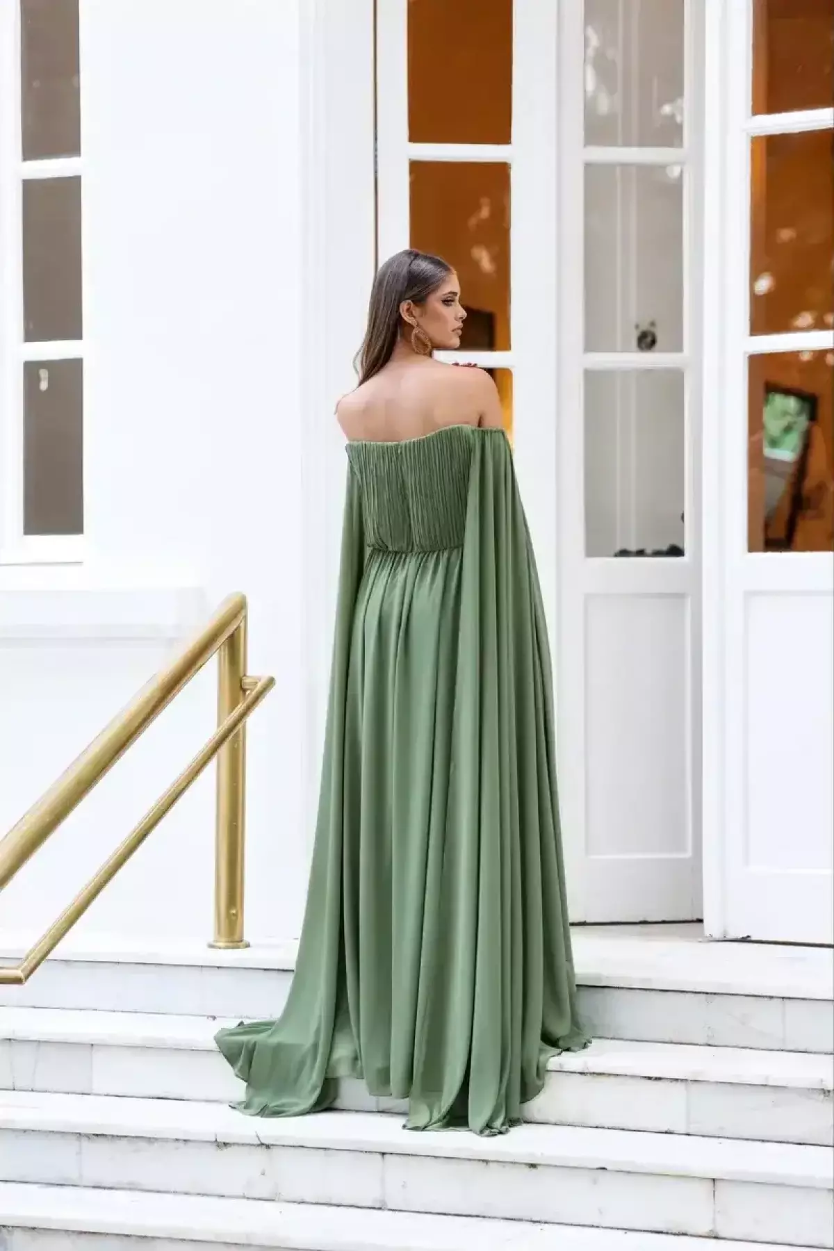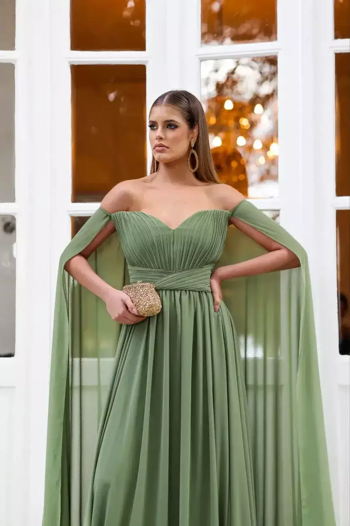 Descrição:Vestido longo verde oliva com manga longa simulando capa