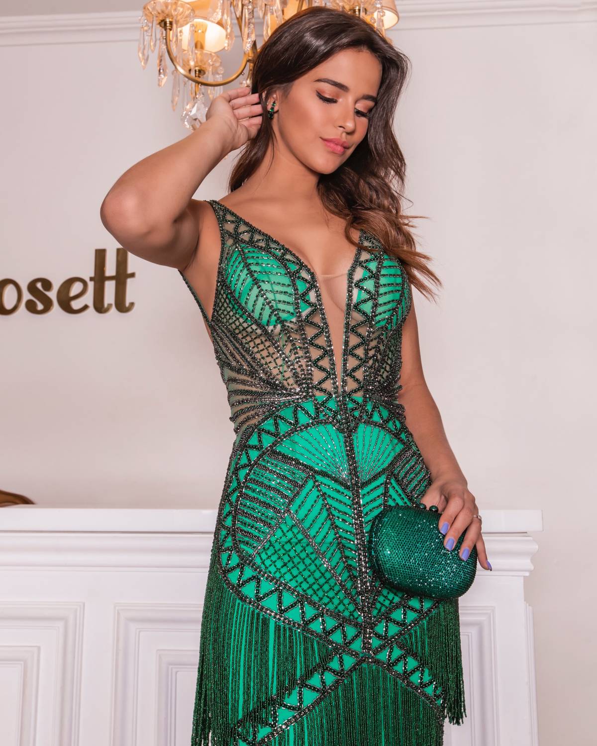 Descrição:Vestido longo verde todo bordado em verde e chumbo, com detalhes em franjas na saia.
