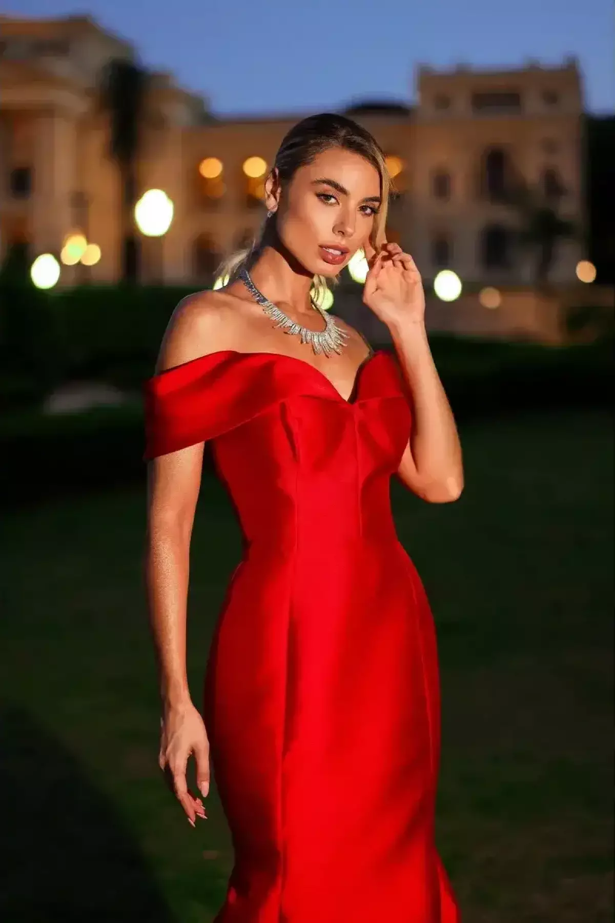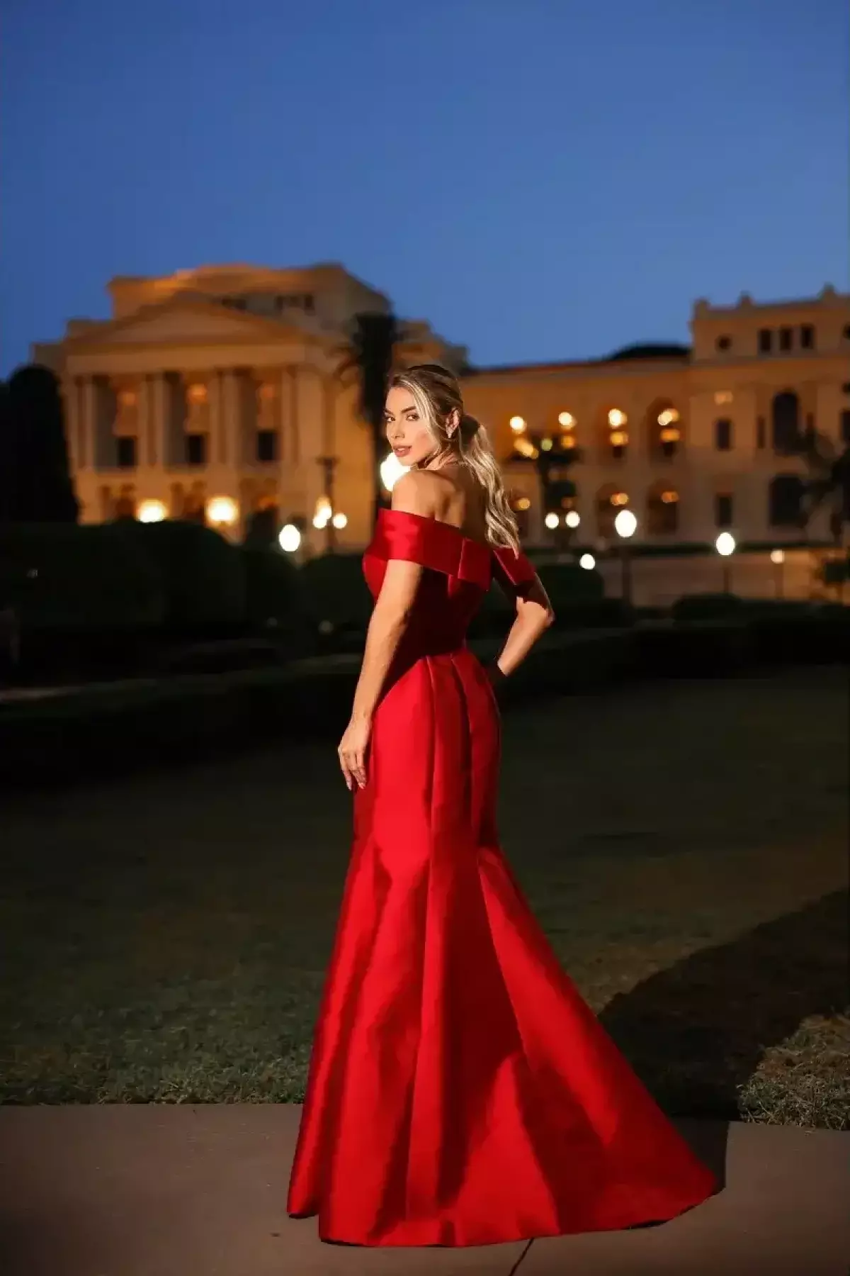 Descrição:Vestido vermelho ombro a ombro sereia alfaiataria