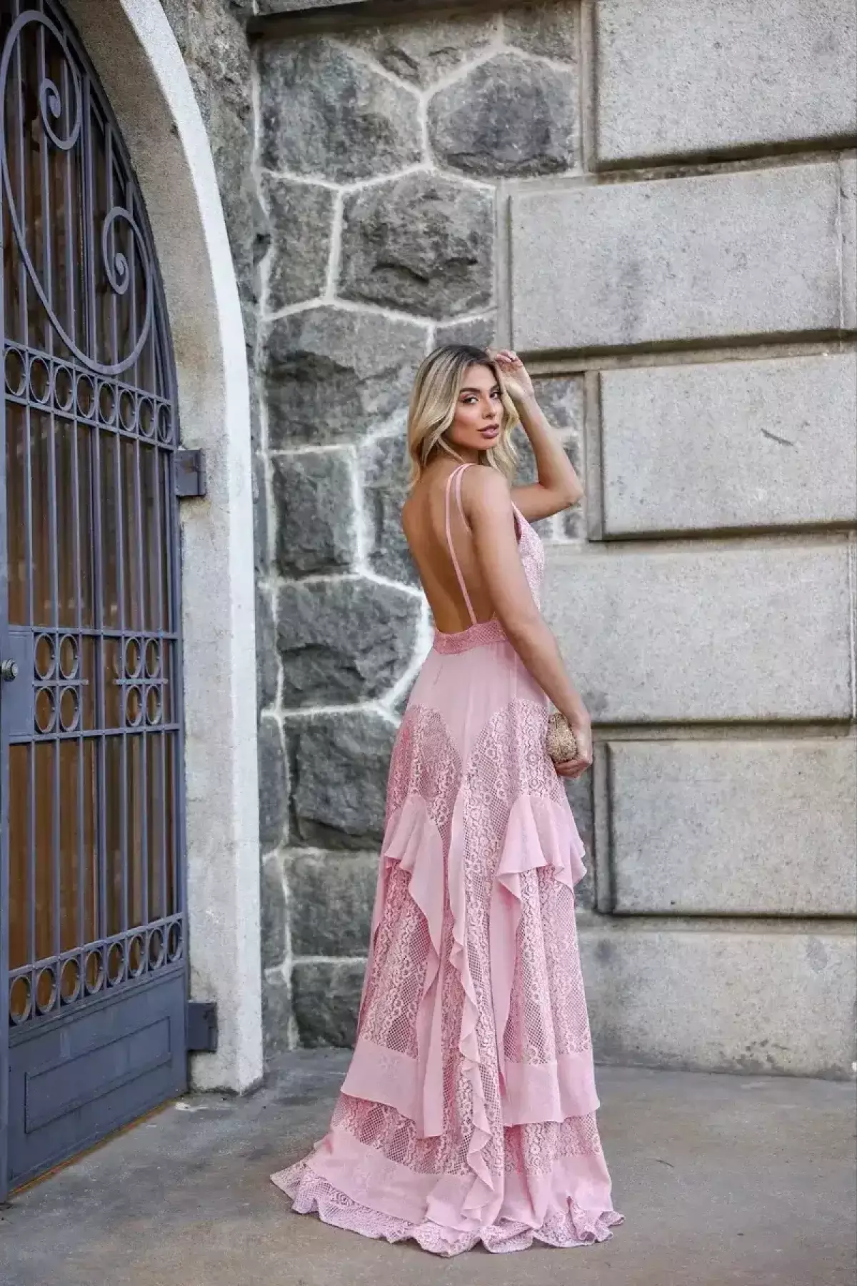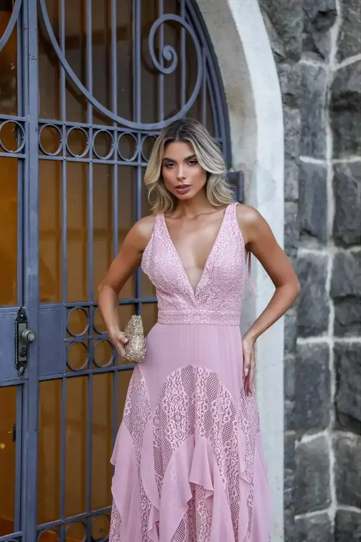 Descrição:Vestido rose/rosa fluido com renda.