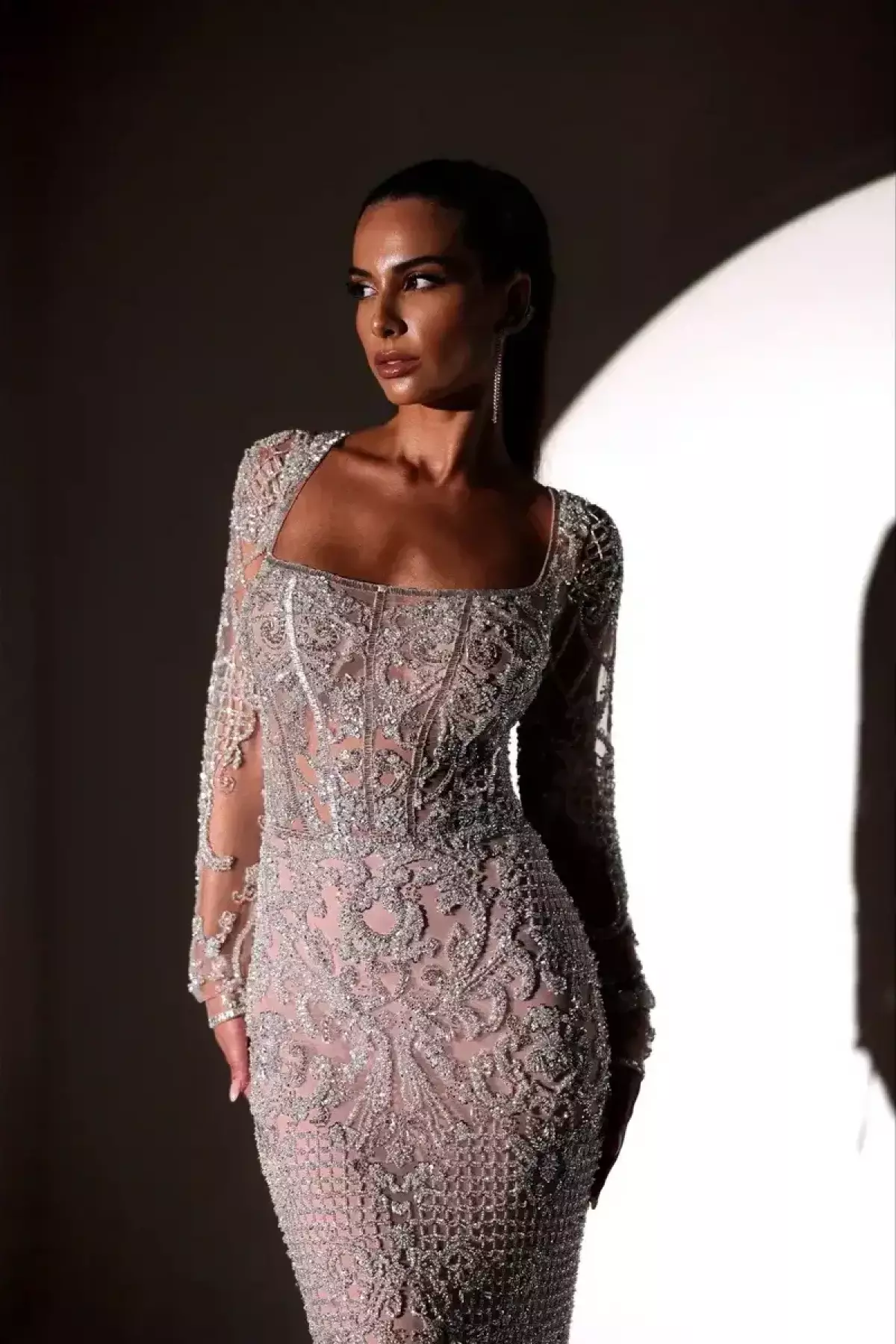 Descrição:Vestido longo da Clara Nato, todo bordado e com mangas longas na cor nude com pedraria prata.