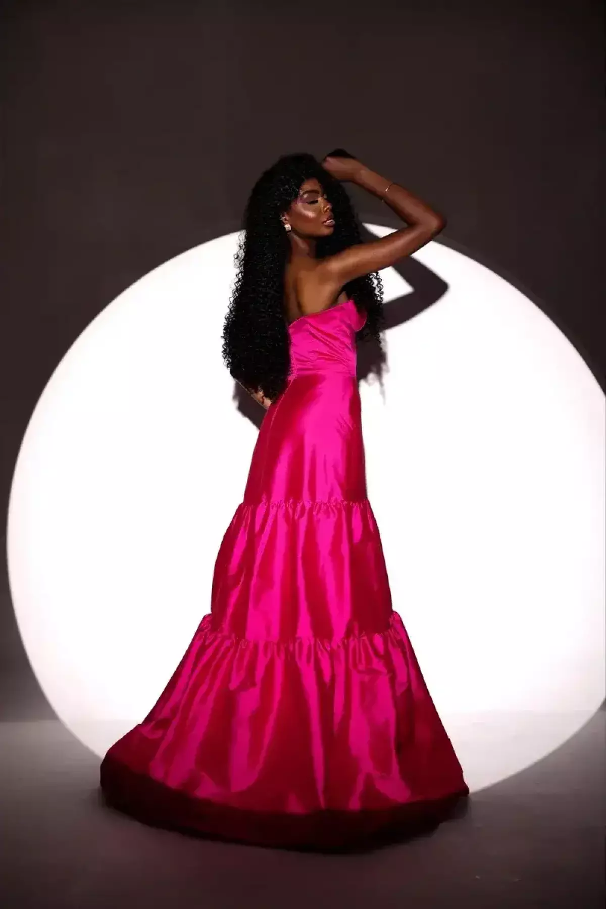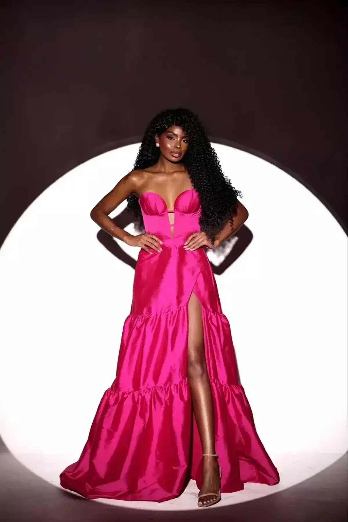 Descrição:Vestido longo tomara que caia pink com fenda e saia balonê
