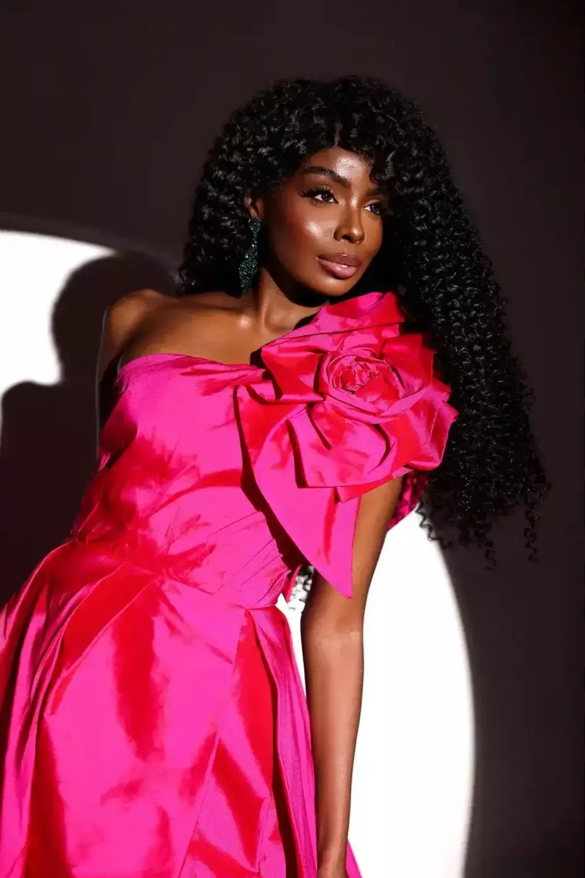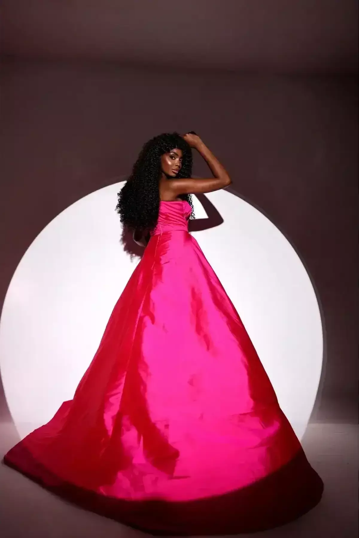 Descrição:Vestido pink em tafetá com maxi flor e fenda