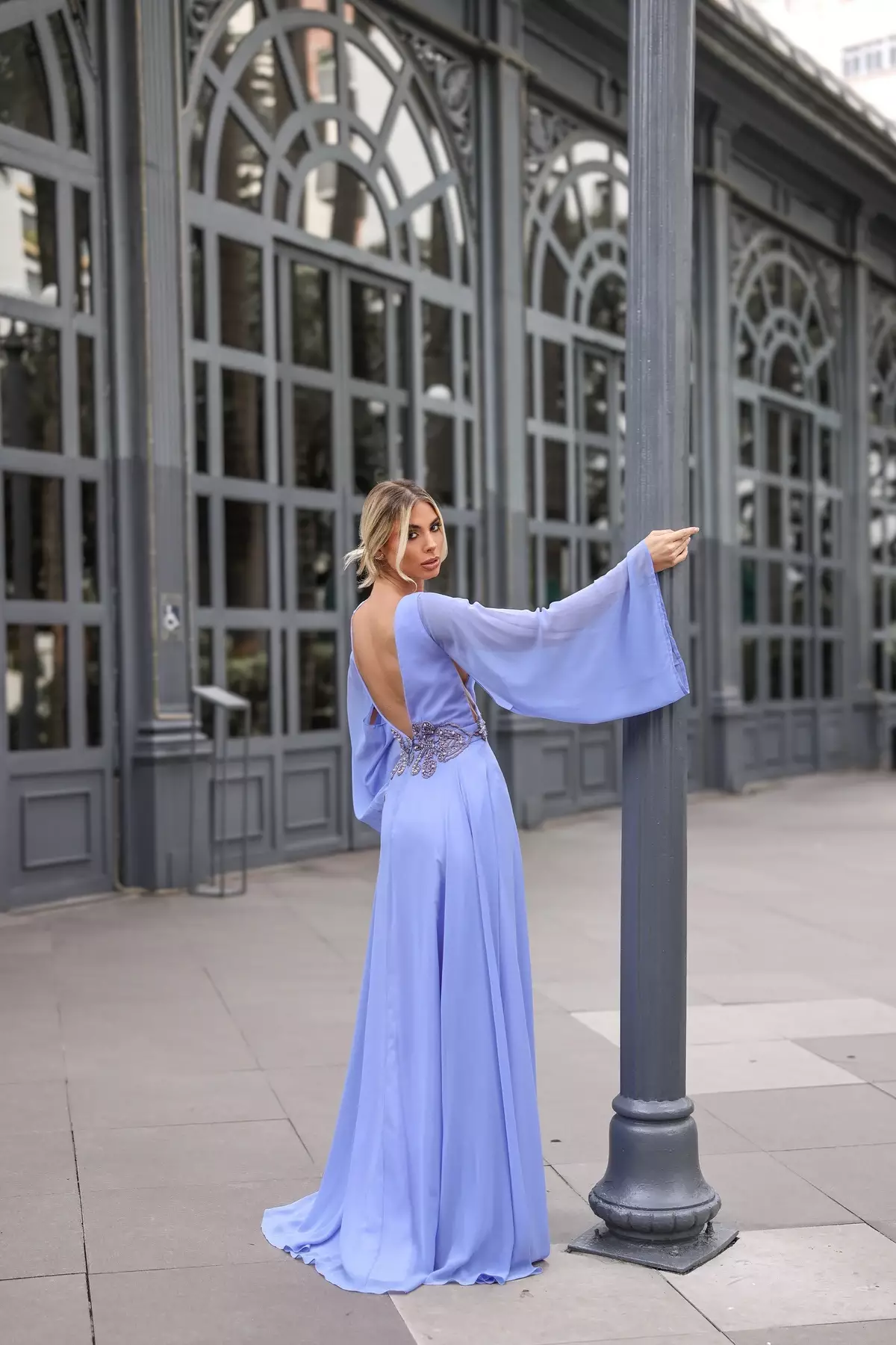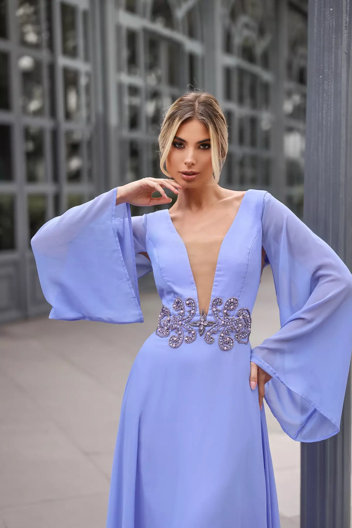 Descrição:Vestido longo liso com manga longa bufante azul serenity e detalhe bordado na cintura em prata e chumbo.