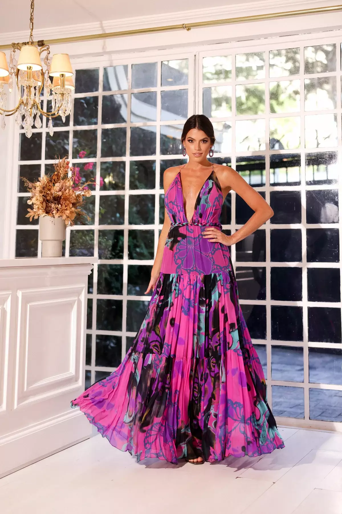 Descrição:Vestido longo colorido, com alças finas e decote profundo no busto.