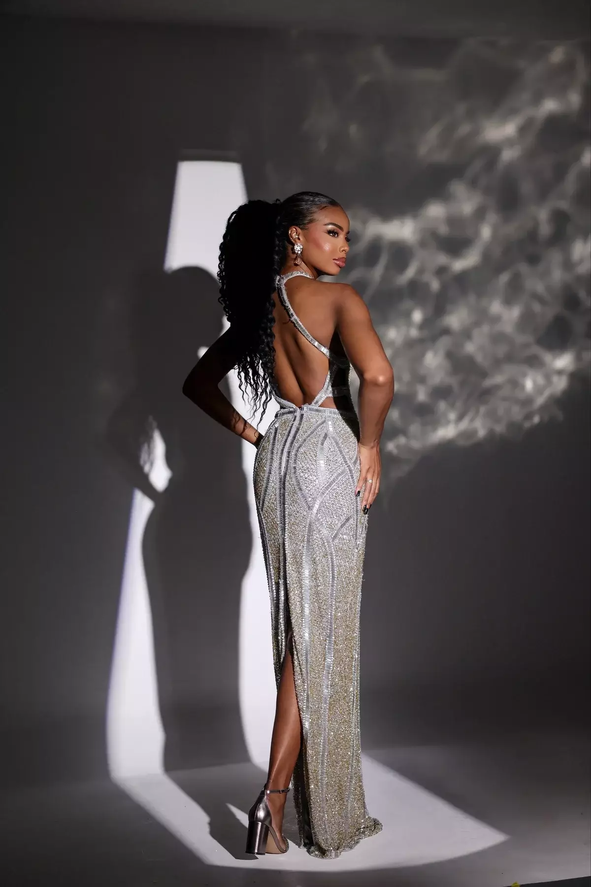 Descrição:Vestido bordado prata e dourado com decote no busto e detalhes nas costas