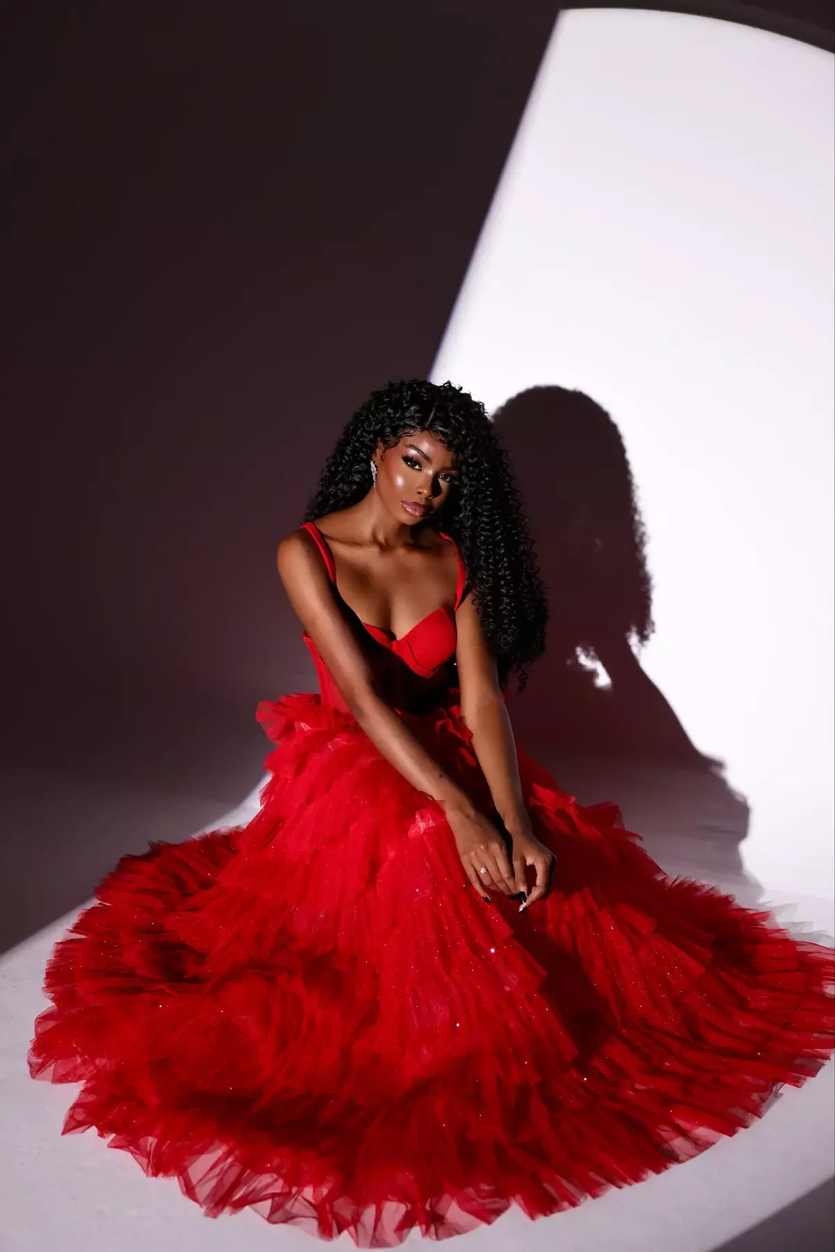 Descrição:Vestido longo de corselet vermelho com tule de glitter e saia em camadas / babados estruturada com crinol