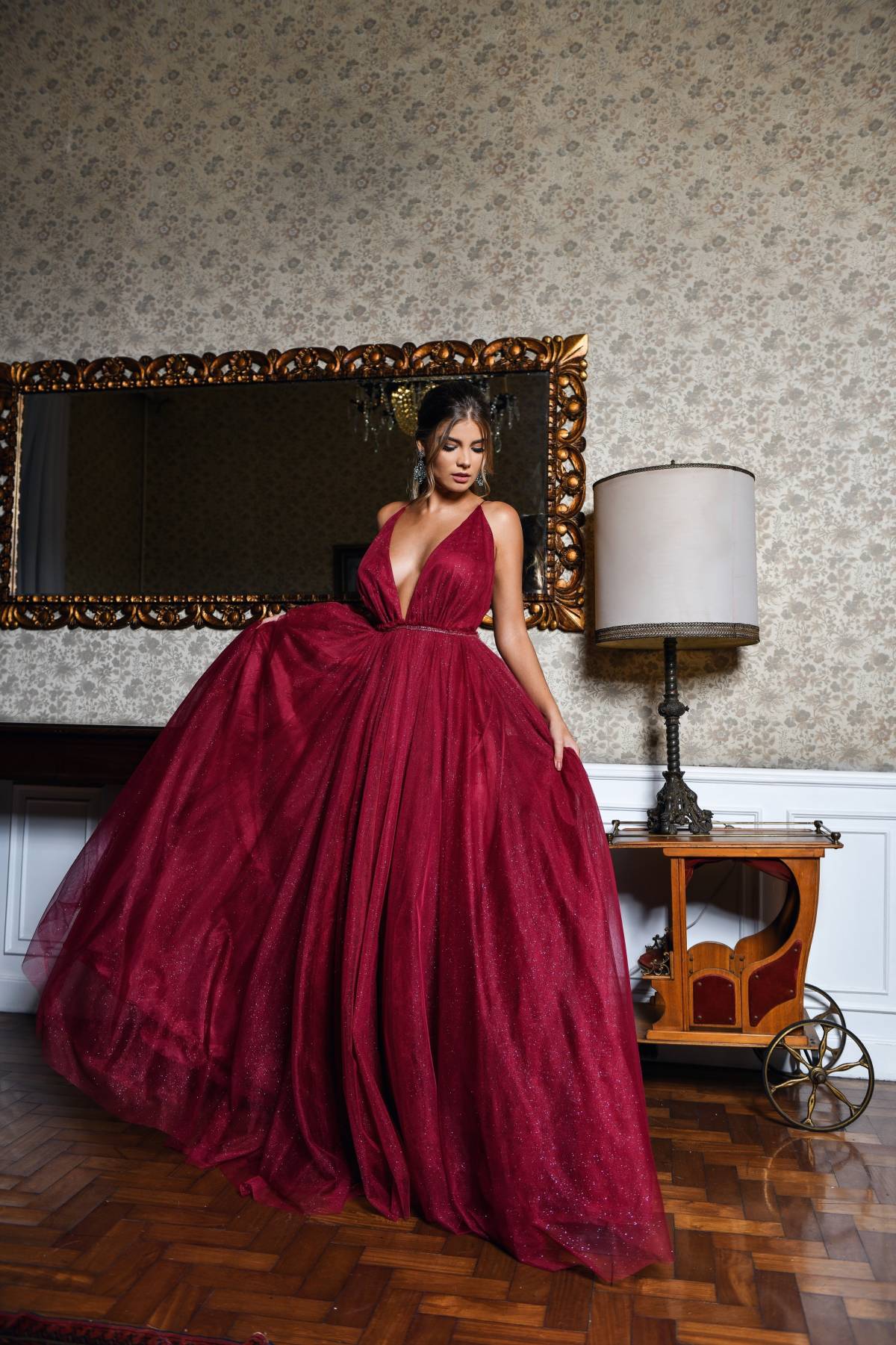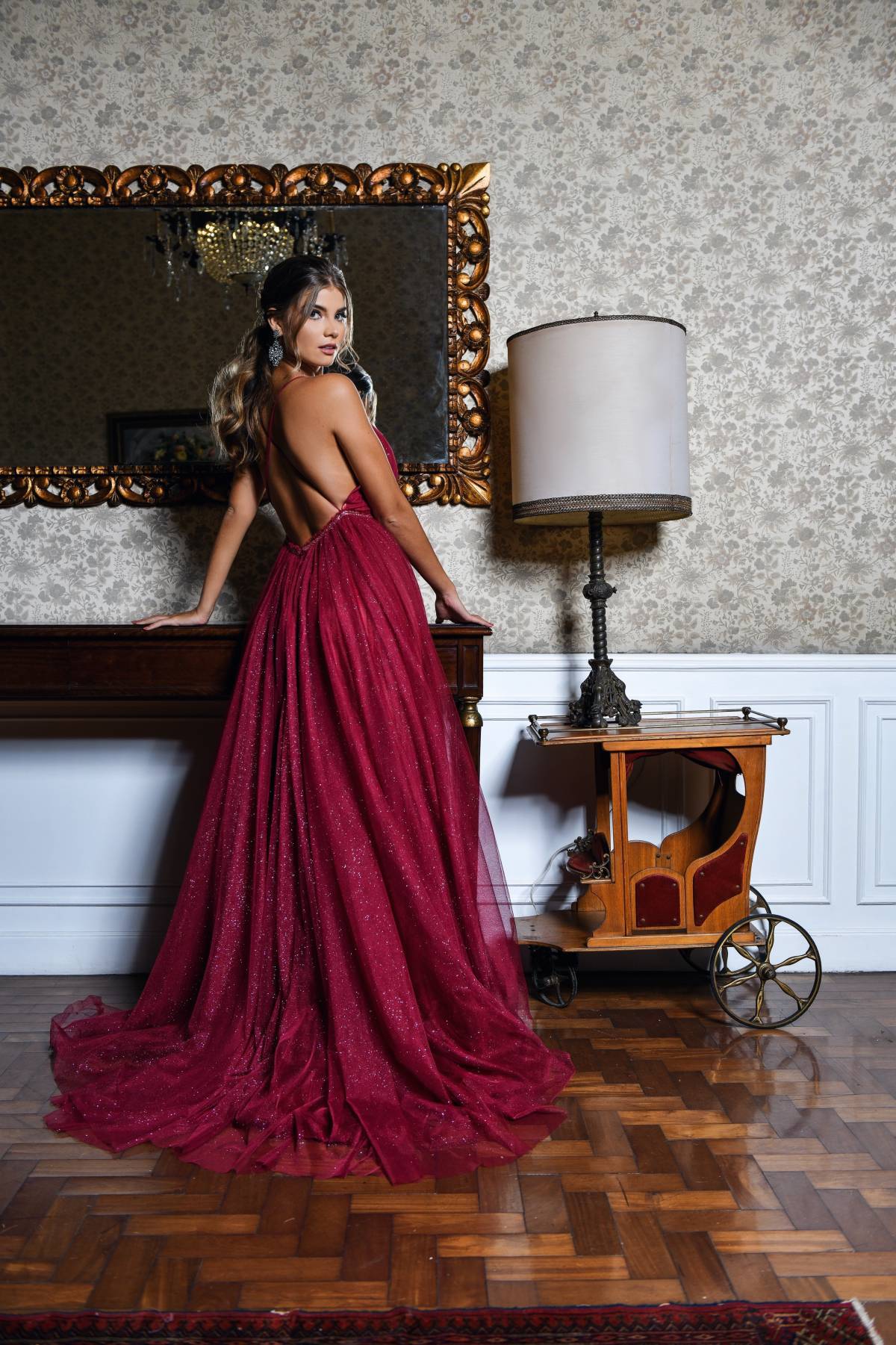 Descrição:Vestido longo marsala de tule estrela com brilho, com decote no busto e nas costas.
