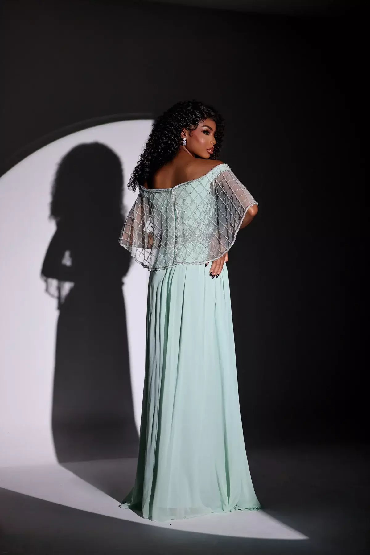 Vestido longo verde menta com busto bordado em prata e chumbo e manga estilo capa