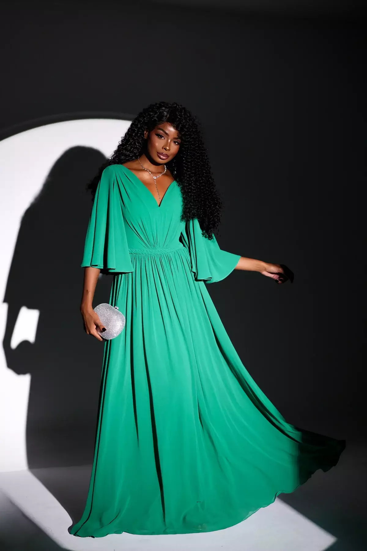 Descrição:Vestido verde bandeira, fluido e drapeado de mangas.