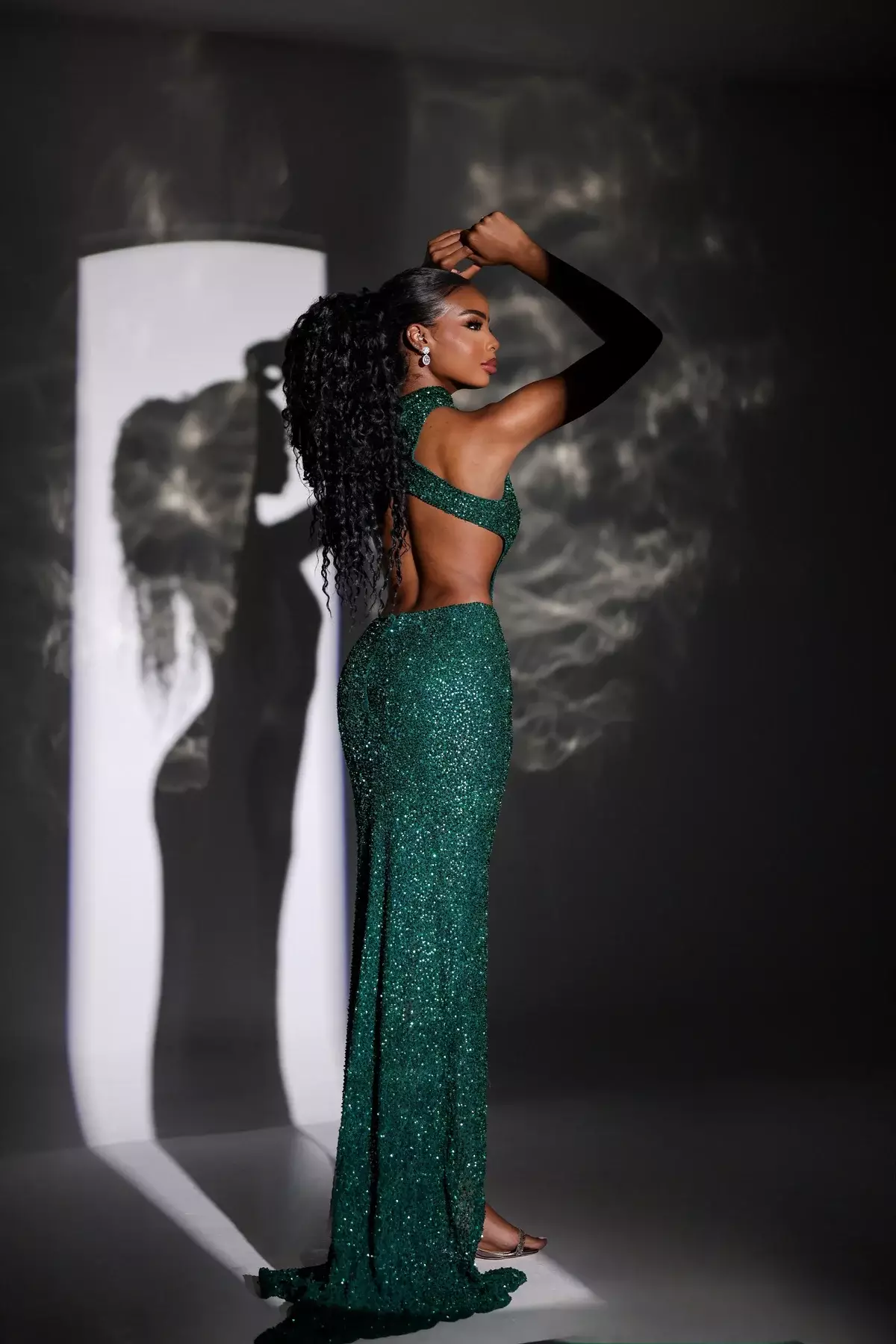 Descrição:Vestido verde esmeralda bordado frente unica com detalhe no pescoço e costas nuas, tem gola, recorte e paete.