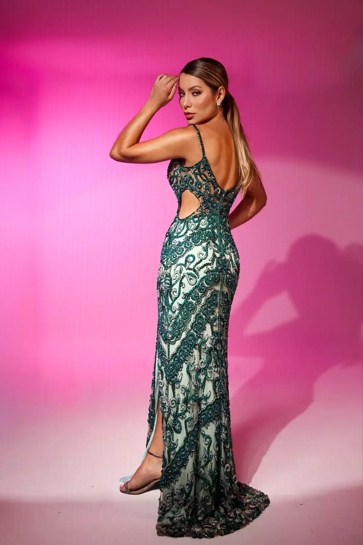 Descrição:O modelo possui saia reta, todo bordado em cristais, decote em "v", alça fina, recortes na cintura e fenda