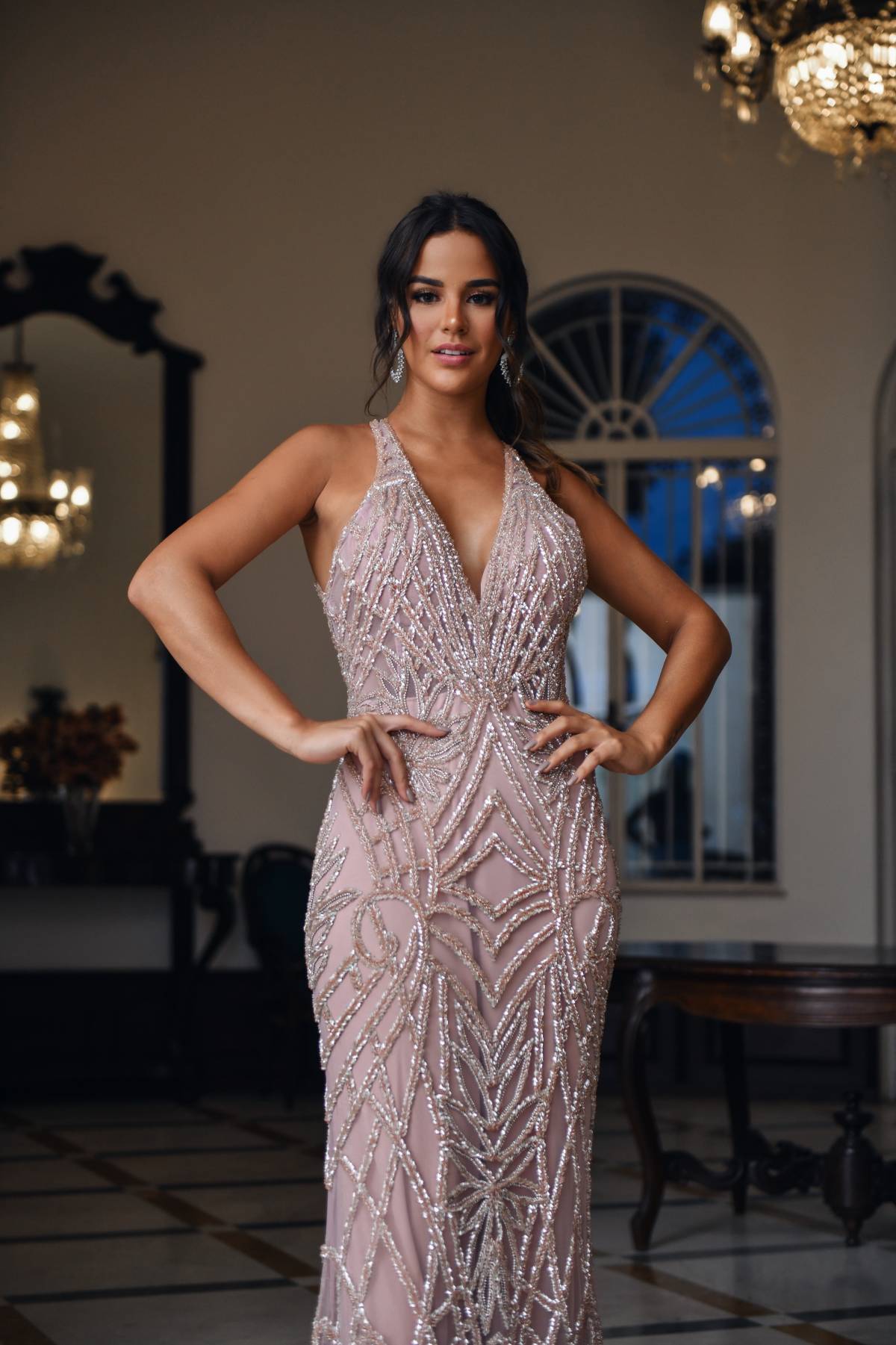 Descrição:Vestido longo todo bordado no tule com decote nas costas.