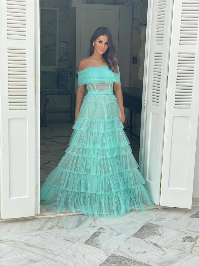 Descrição:Vestido longo todo confeccionado com tule, com coselet no busto, saia em camadas e decote ombro a ombro.