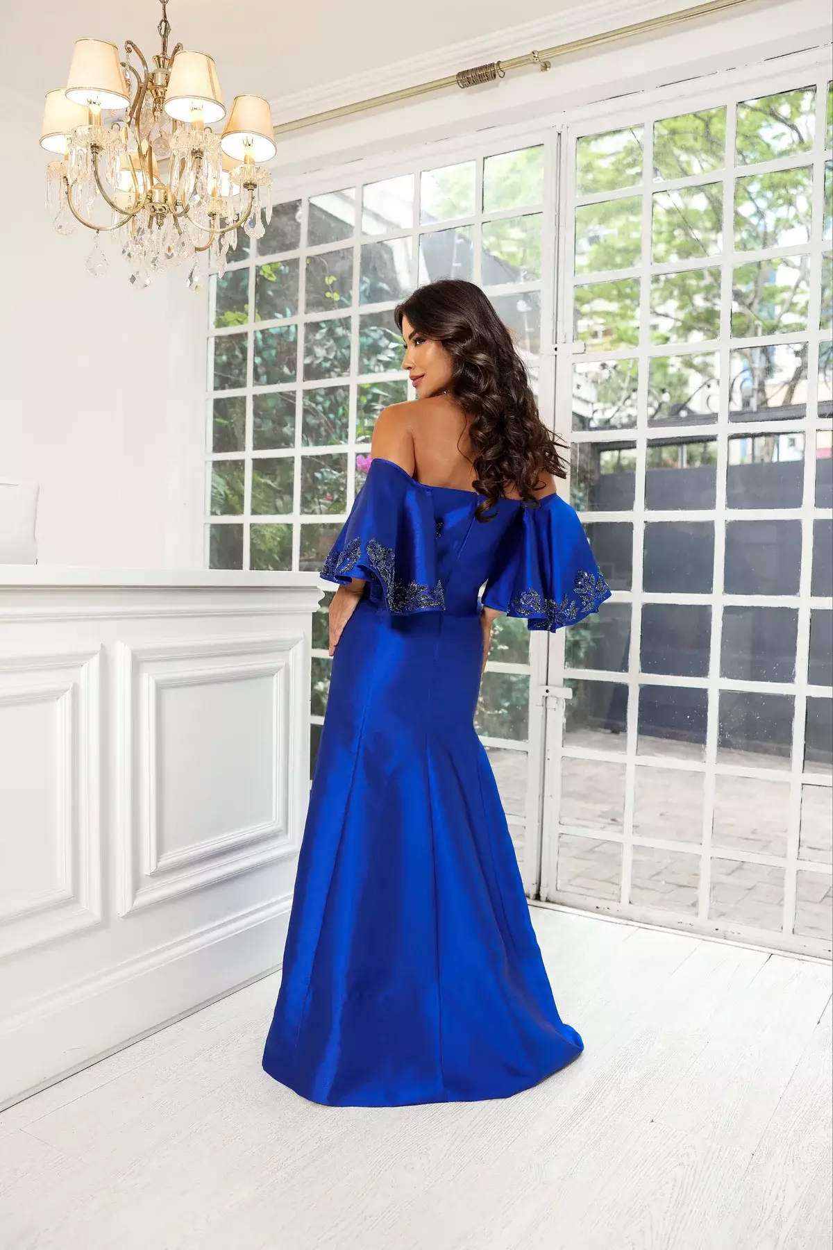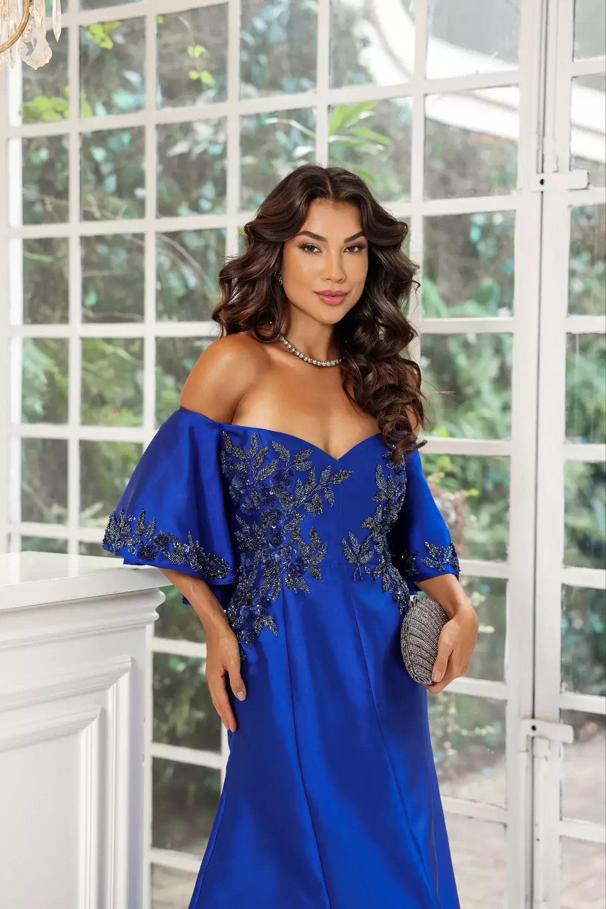 Descrição:vestido azul royal em alfaiataria ,ombro a ombro com semi bordado nas mangas e na cintura.