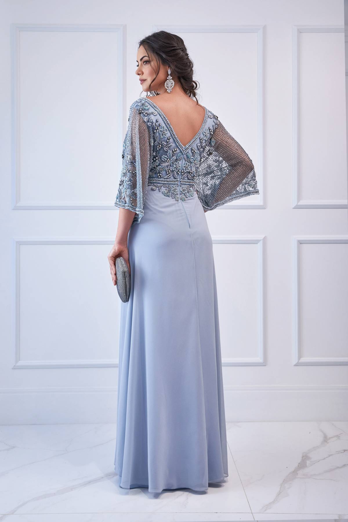 Descrição:Vestido longo azul claro com manga flair, busto todo bordado m vidrilhos e cristais, com saia fluida lisa.