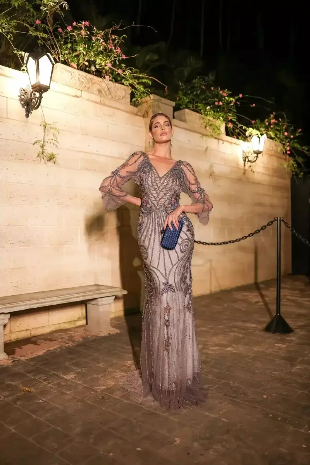 Descrição:Vestido longo de franjas azul claro todo bordado  em cristais e vidrilhos com saia de franjas bordadas em missanga.