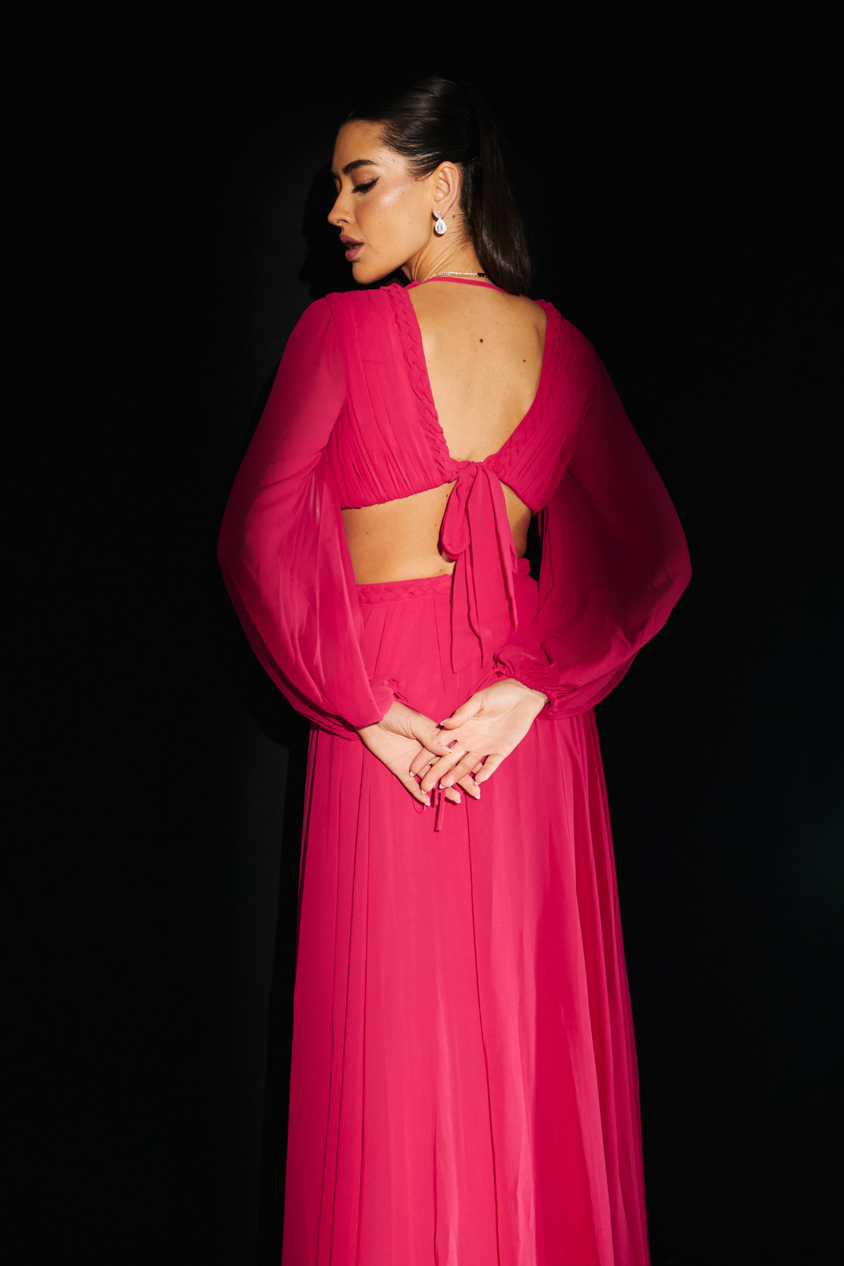 Descrição:Vestido magenta/rosa fluído, com trançado no busto e aberturas nas laterais e mangas longas