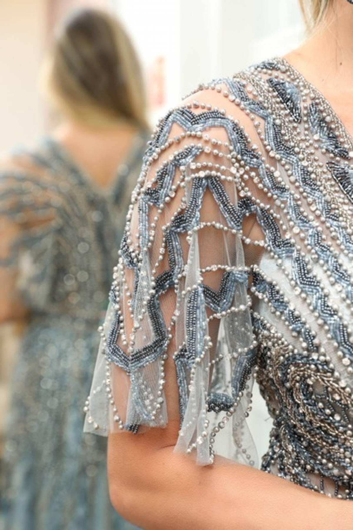 Descrição:Vestido longo azul claro com bordado em tons de azul e chumbo, decote v na frente e manga morcego.